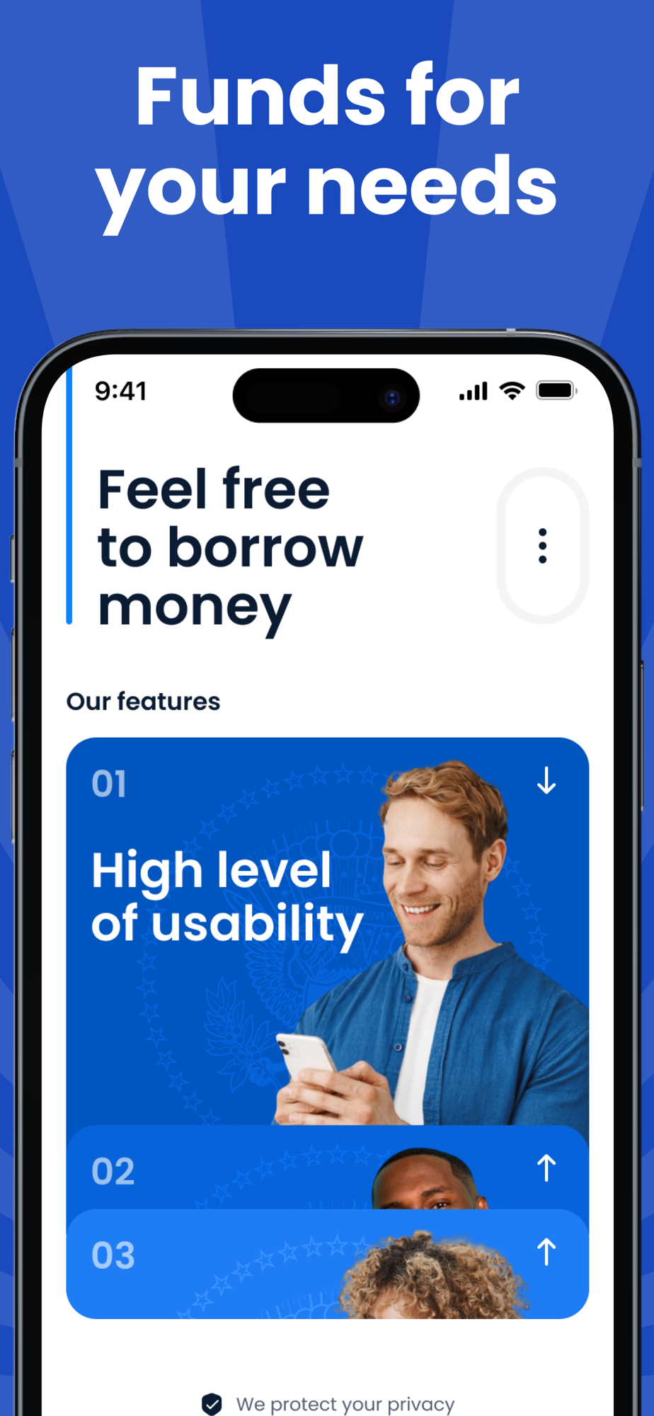 We’ll ensure the confidentiality and security of your data. Borrow Money app uses double encryption, so you don't have to worry about data leakage. Professionals worked on its development. After all, our American Advance Loan application is convenient, simple, and helps to achieve goals!