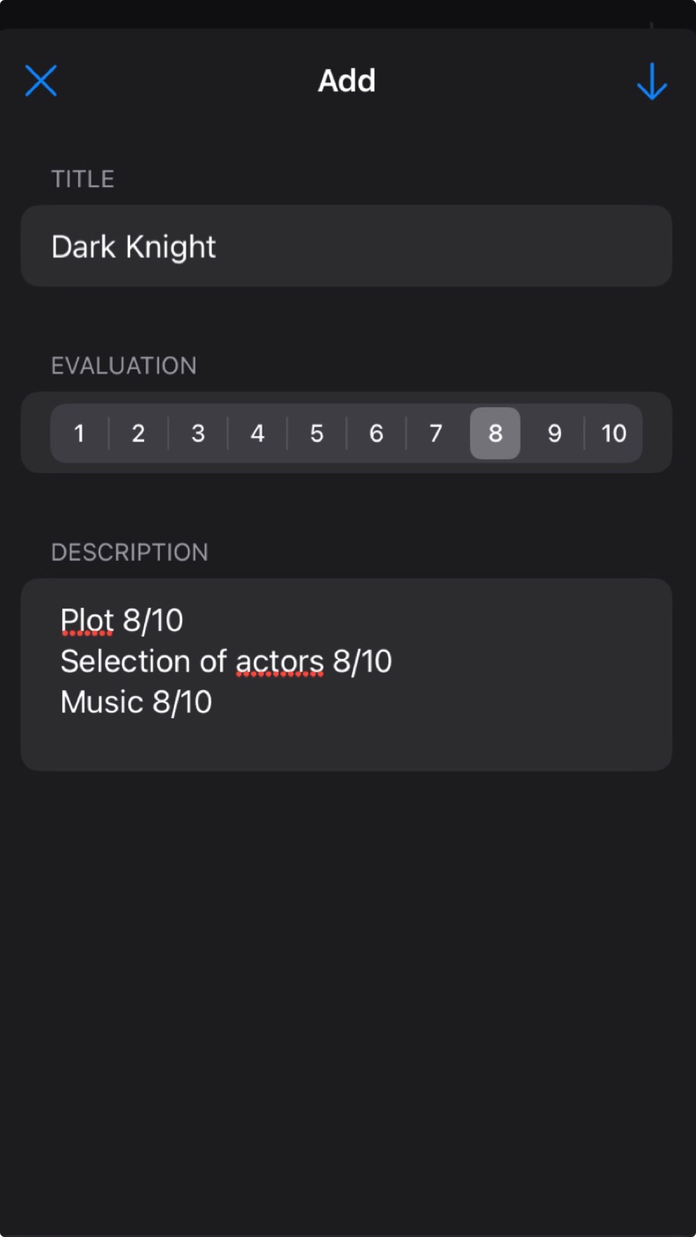 Review's app is designed to evaluate movies, TV series, music albums, games, books and much more.The application has a simple and intuitive interface. The process of creating a review consists of three stages: 1) Title, 2) Evaluation, 3) Description.