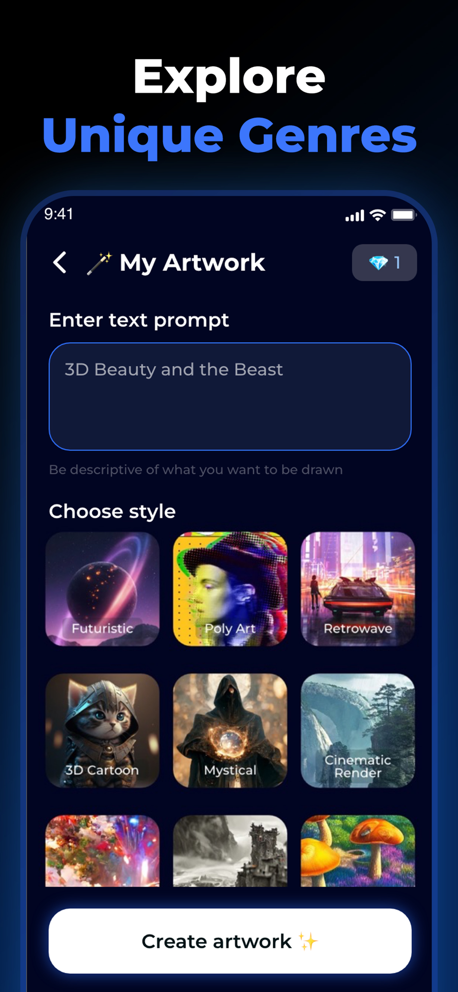 Create unique and beautiful artwork using AI. Just enter a prompt and pick your preferred art style then let AI Art Generator amazes you with an unpredictable AI-powered painting art in seconds.