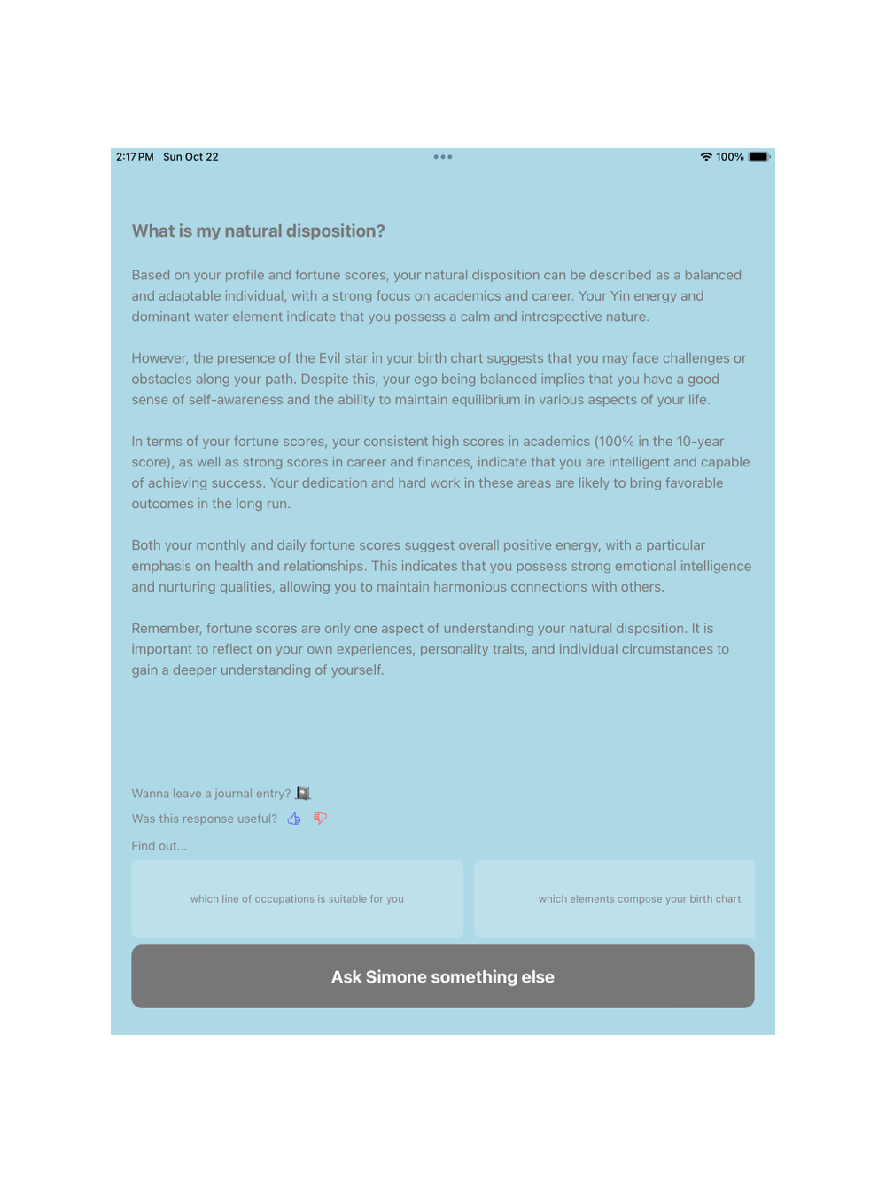 Saju Palja is an ancient Eastern philosophical system rooted in Chinese astrology and the principles of Yin and Yang. It explores the interplay between the Five Elements (Wood, Fire, Earth, Metal, and Water) and provides valuable insights into a person's destiny and life path. BeMindful leverages this profound knowledge to help users gain a deeper understanding of themselves and the world around them.