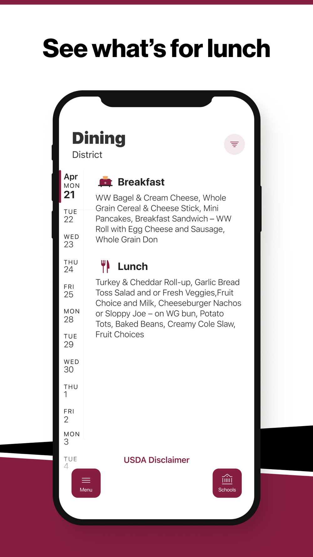 Within the dining section, you’ll find an easy to navigate, weekly menu, sorted by day and meal type.
