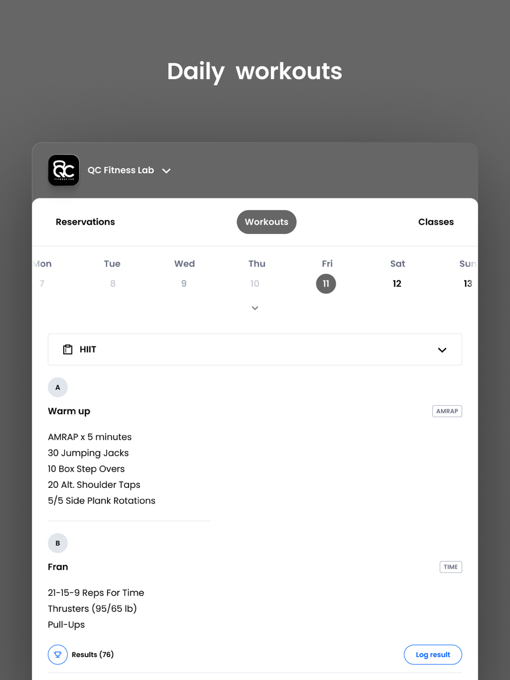 For members of QC Fitness Lab to reserve their place in a class, sign up for gym events, and general account management like updating headshots and credit card on file.