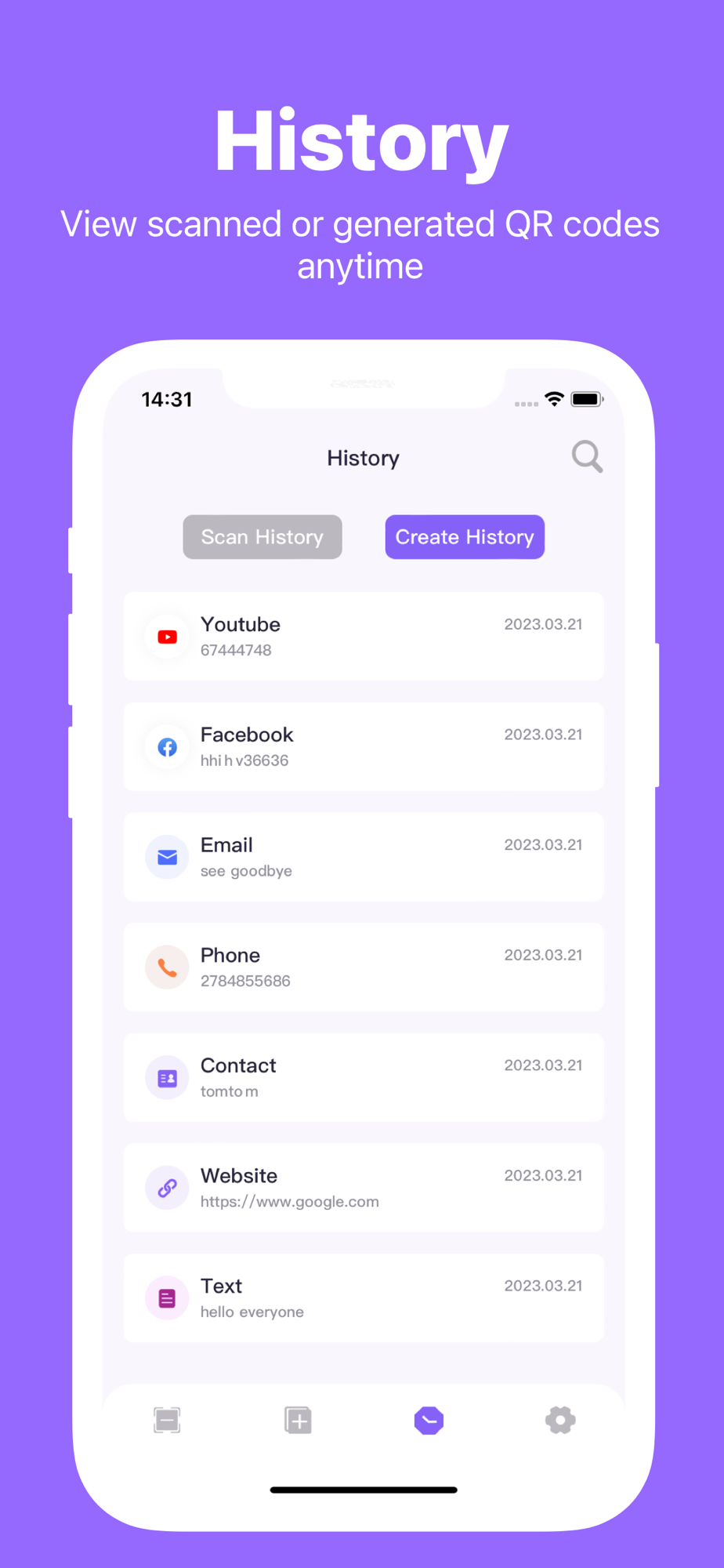 -Scan history and creation history: View your scan records and QR code creation history for easy retrieval of past information.