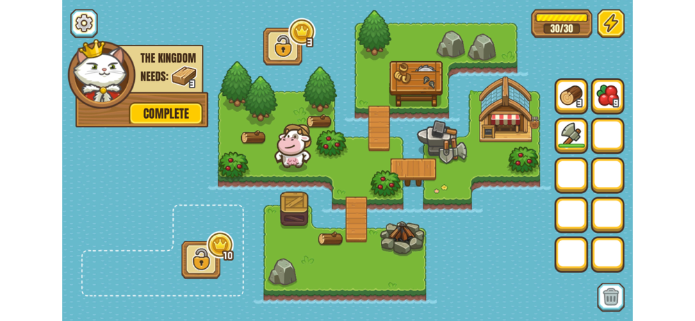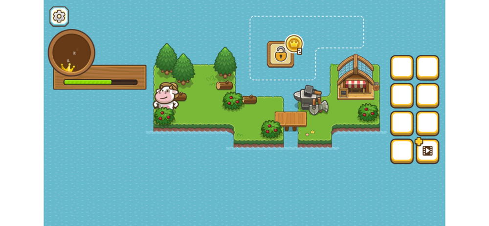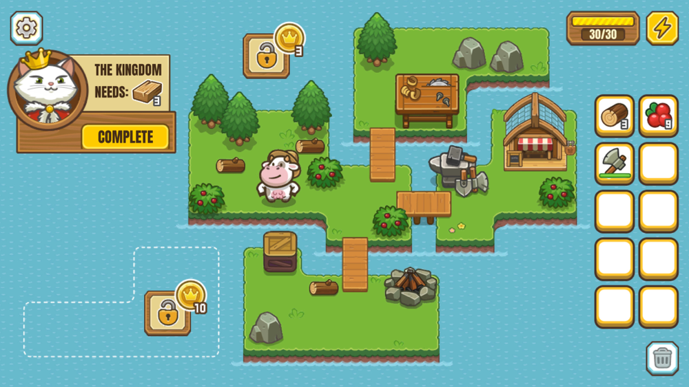 Cow Bay is an idle simulation game where you take the role of a farmer cow who harvests various crops and crafts tools. The governor (who is a cat) asks you to turn this empty but fruitful piece of land into a bustling settlement from scratch. You start simple by picking up berries and collecting wooden logs. Then the quests will evolve into more complex tasks like cutting down trees, sewing seeds, and crafting equipment. As you complete the governor's quests, you will earn coins to unlock and explore more islands that will introduce many improvements like a crafting table where you can make axes, pickaxes, shovels; a campfire that lets you cook recipes to replenish your energy; and storage boxes to unload extra items. Each task costs an energy, so make sure to keep an eye on it at all times. Cow Bay has lots of surprises in its sleeve waiting for you to explore! Play this relaxing pastoral experience on your device, and don't forget to share it with your friends and find out who can build the best settlement!
