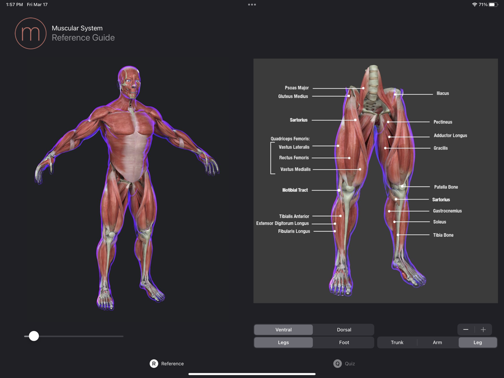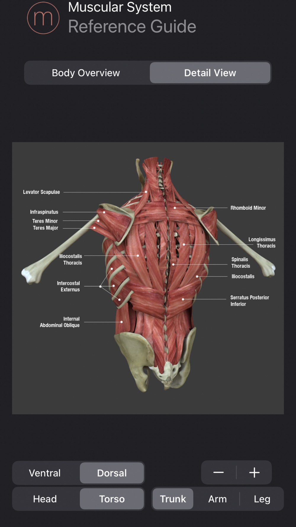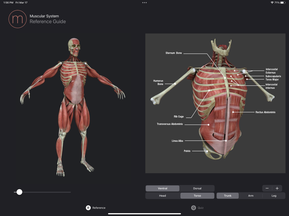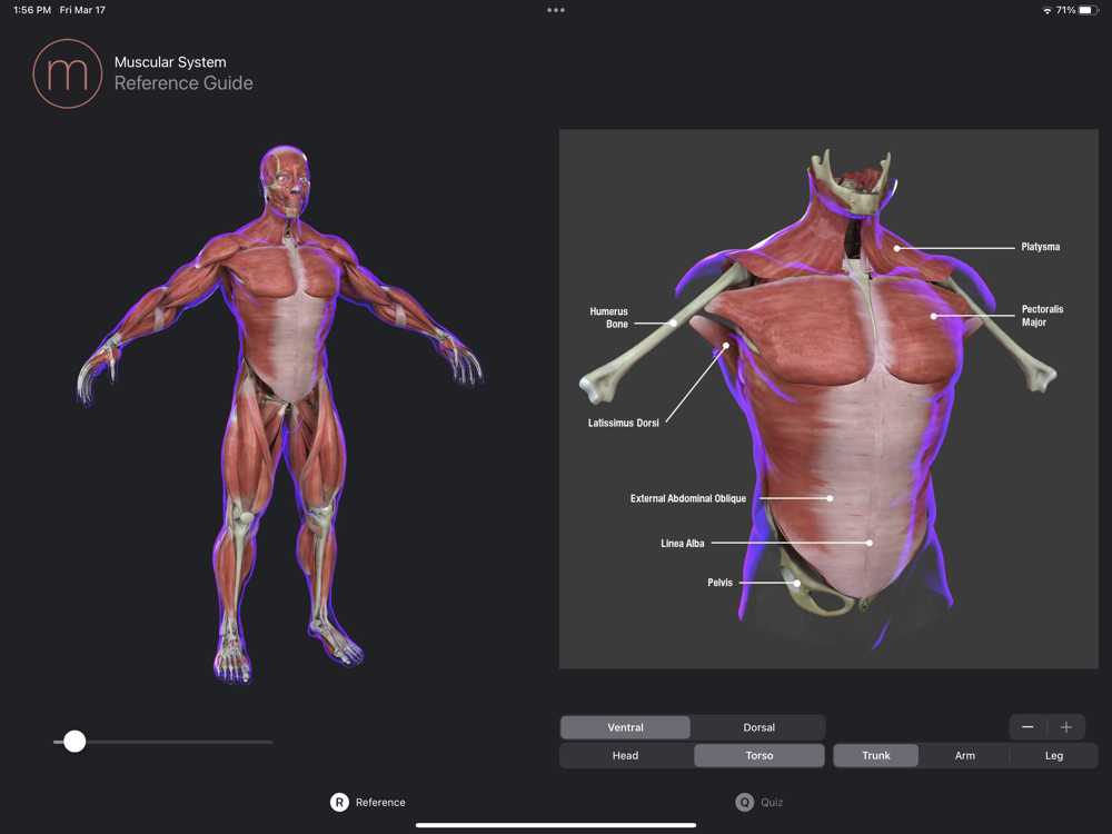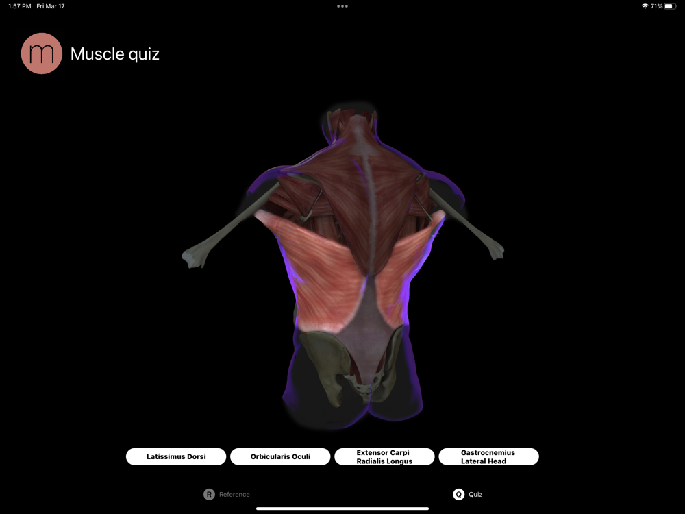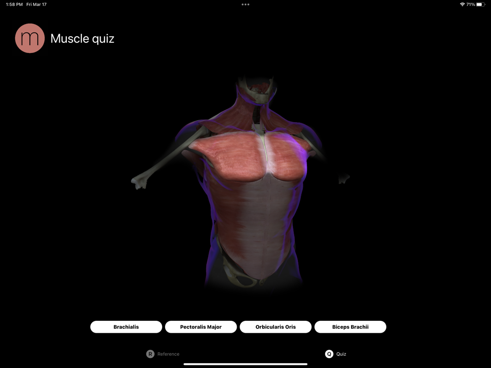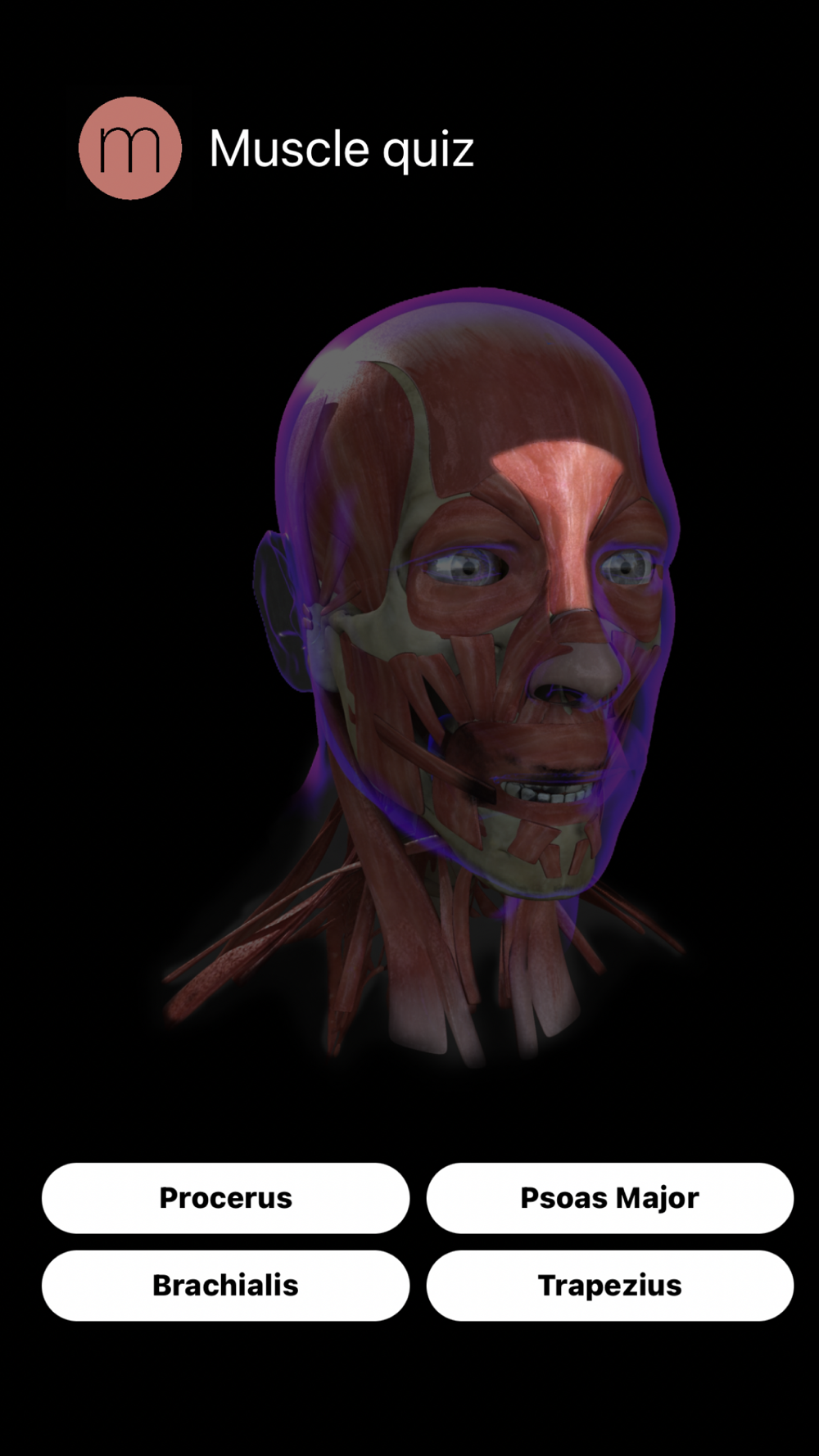 Learn muscle anatomy with this beautifully designed app. A complete muscle reference guide will teach you the names of 8 layers of muscles. See the muscles in 360 degrees alongside detailed descriptions. A muscle quiz will test your knowledge what you've learned. A progress indicator is included to gauge how many muscle you were able to correctly answer.