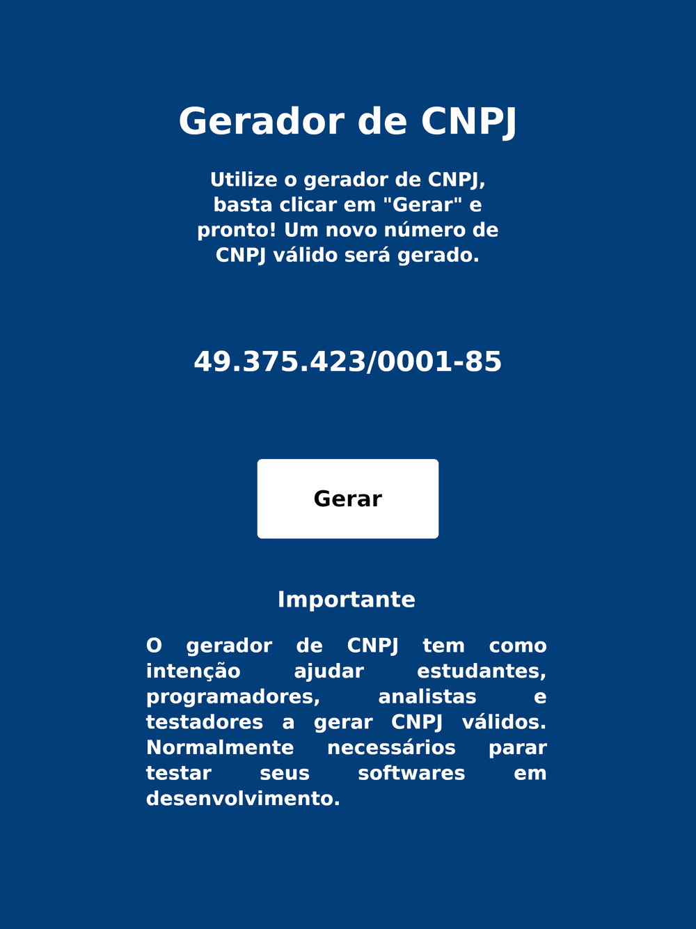 Utilize o gerador de CNPJ, basta clicar em "Gerar" e pronto! Um novo número de CNPJ válido será gerado.