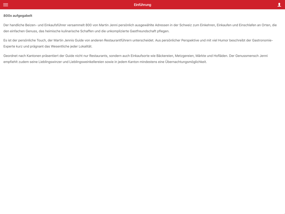 Geordnet nach Kantonen präsentiert der Guide nicht nur Res-taurants, sondern auch Einkaufsorte wie Bäckereien, Metzgereien, Märkte und Hofläden. Der Genussmensch Jenni empfiehlt zudem seine Lieblingswinzer und Lieblingsweinkellereien sowie in jedem Kanton mindestens eine Übernachtungsmöglichkeit.