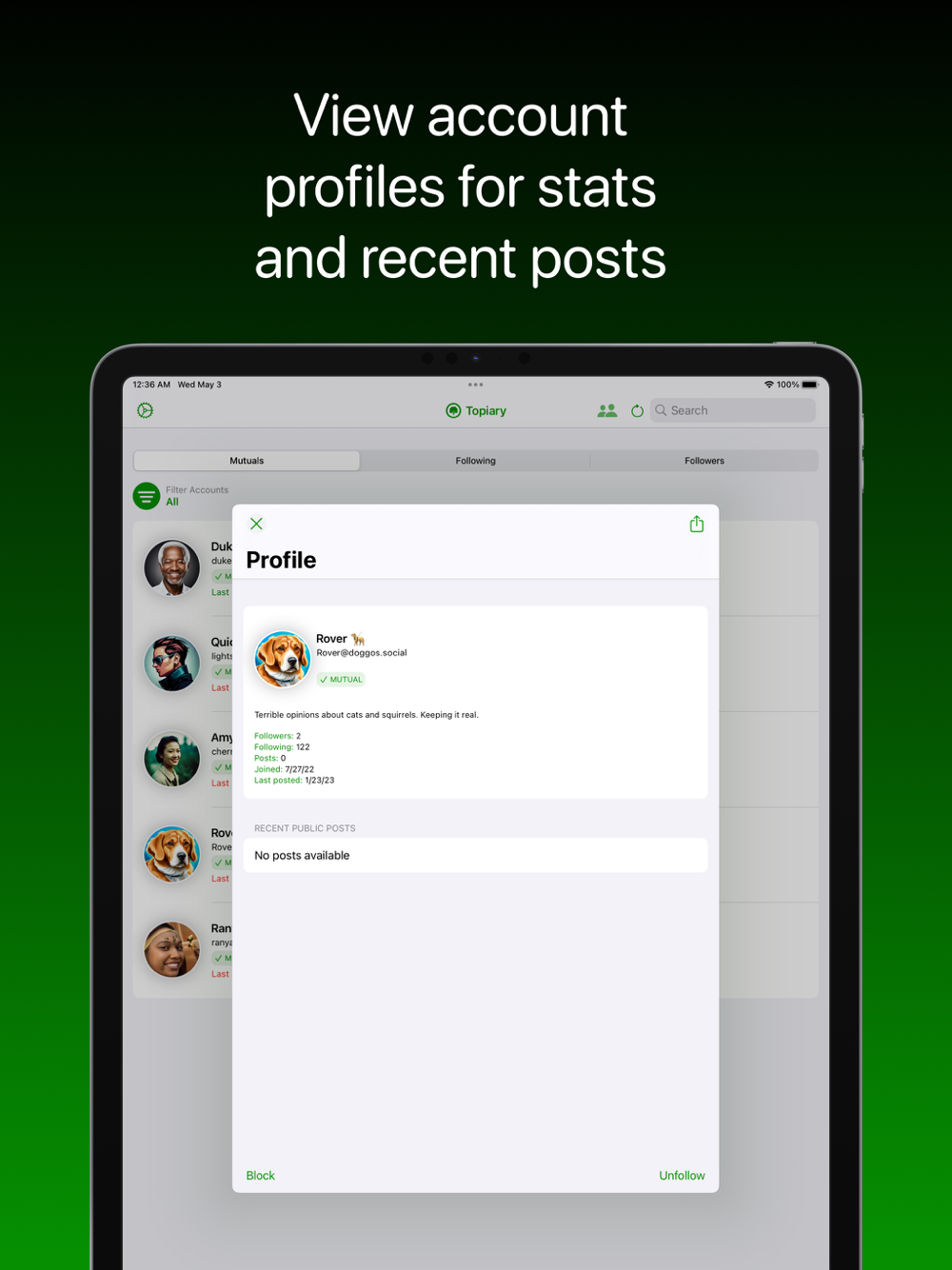 With Topiary, you can take a closer look at both the accounts you follow, and those that follow you.