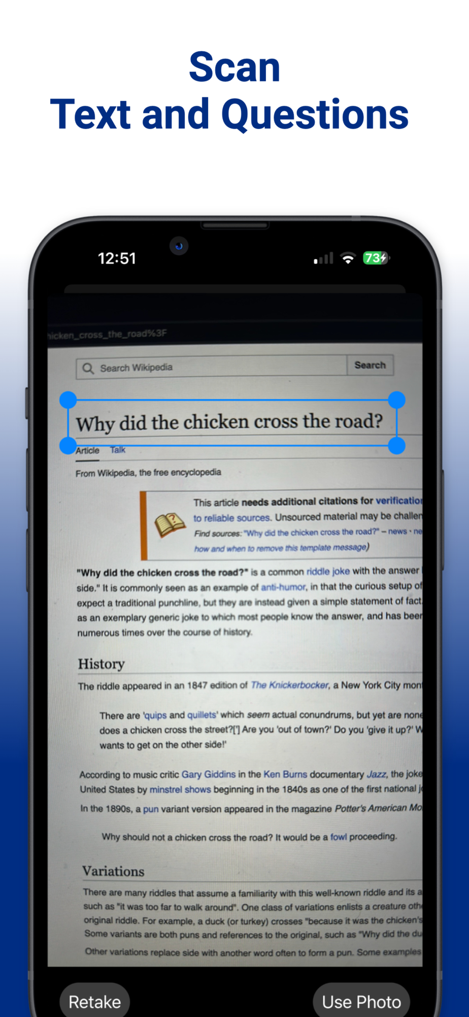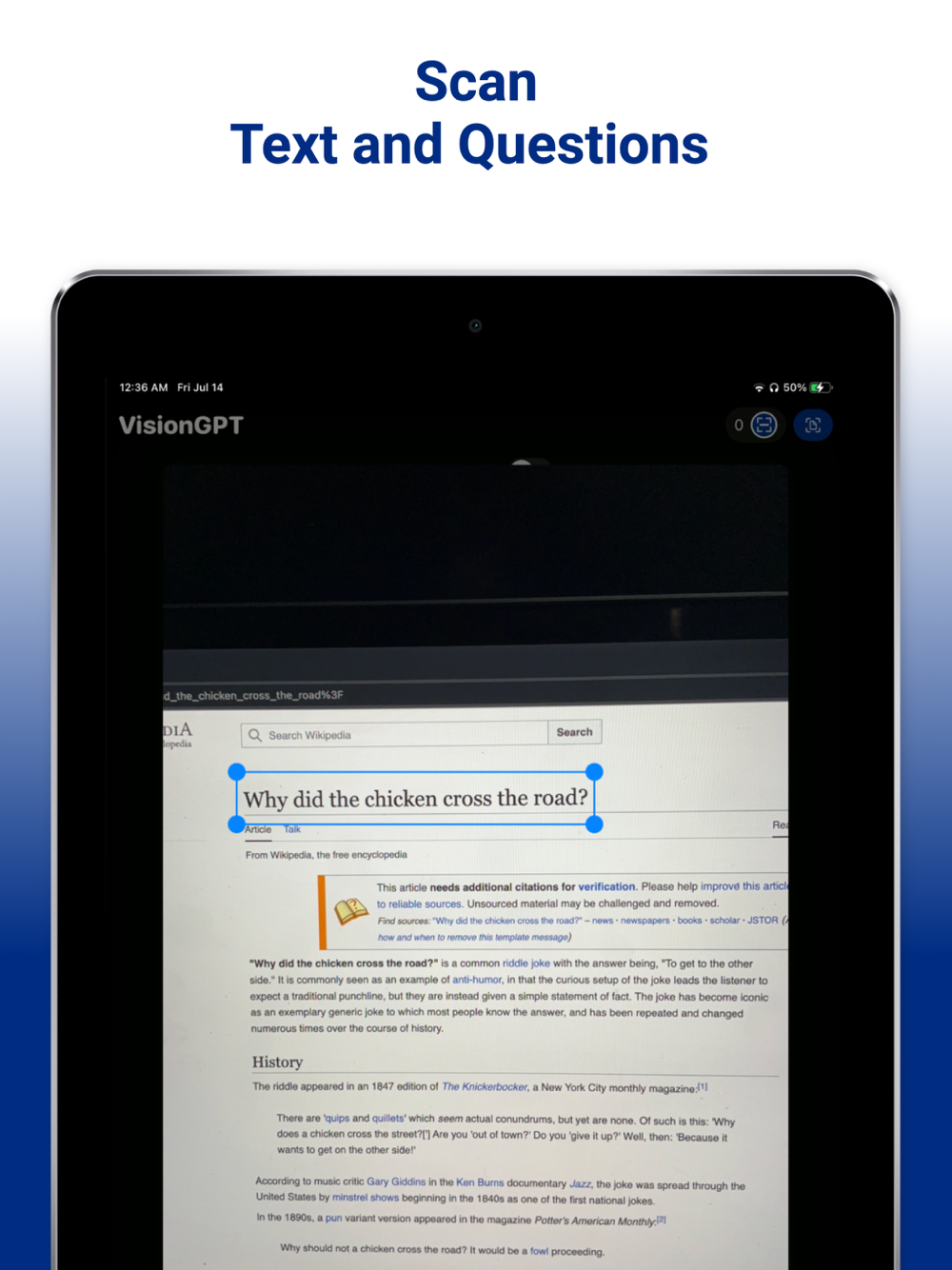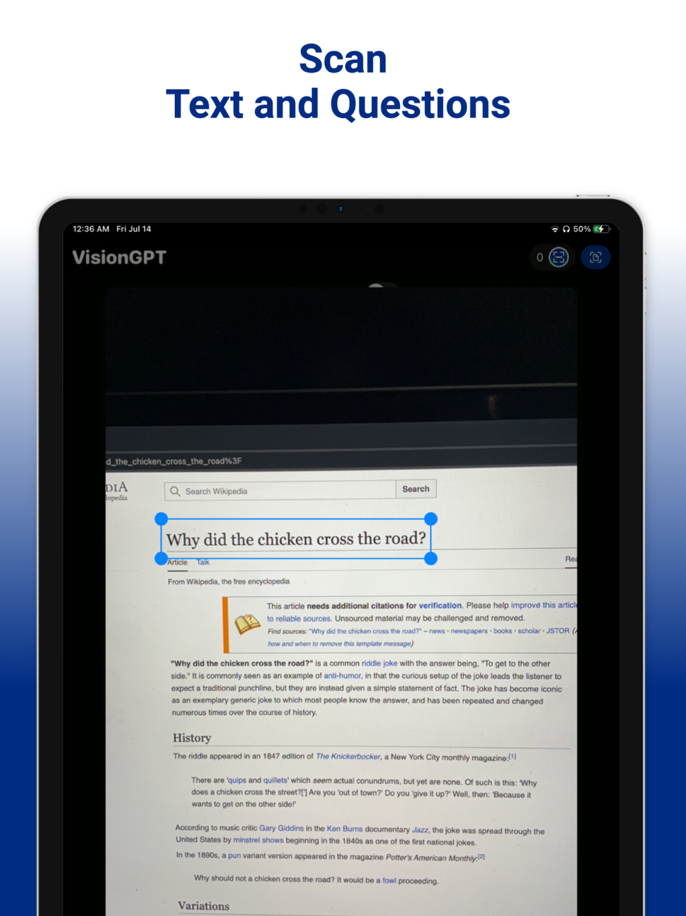 VisionGPT digitizes your world, empowering you to scan any question using your smartphone's camera, from textbooks, articles, notes, or even random graffiti on a wall! Our state-of-the-art text recognition technology turns these textual inquiries directly into data fit for the most advanced natural language processing systems on the planet.