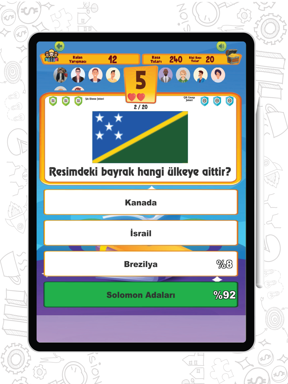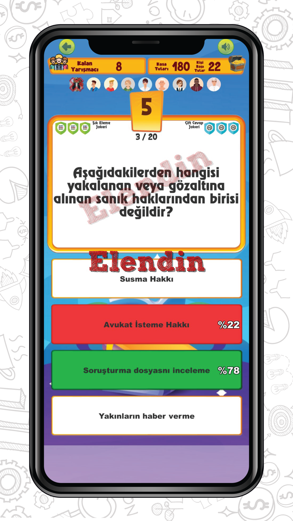 Uygulamada 2 tip joker bulunmaktadır. (1.Çift Cevap Jokeri, 2.Şık Eleme Jokeri) Oyunu ilk yüklediğinizde sistem hediye olarak her iki jokerden de 5'er adet hesabınıza tanımlayacaktır. Oyun esnasında soru ekranının sağ üst köşesinden bu jokerleri kullanabilirsiniz. İlerleyen zamanlarda yeni jokerler satın almak isterseniz oda seçim ekranın alt kısmında bulunan joker yönetim bölümünde kolayca joker satın alabilirsiniz.