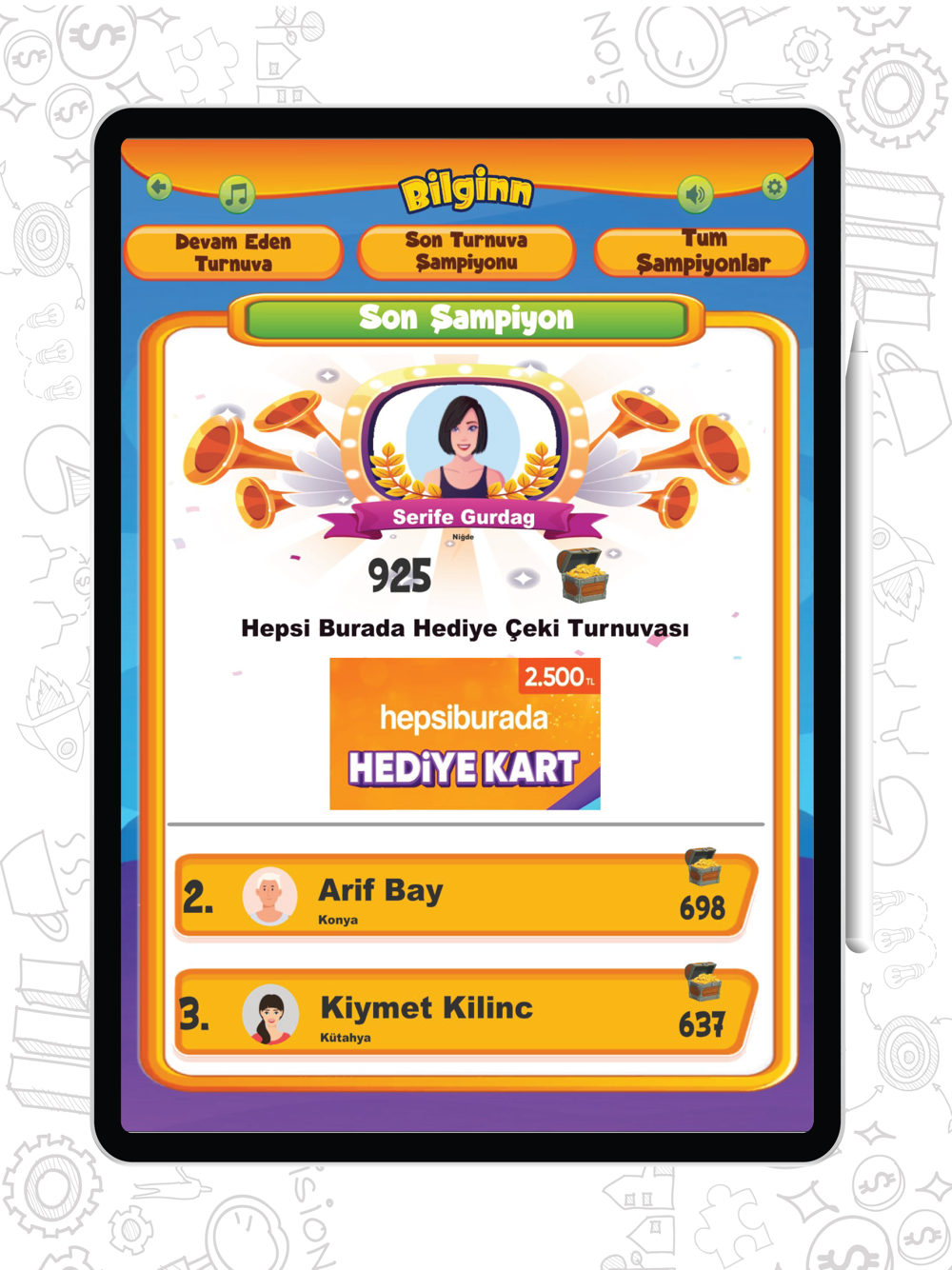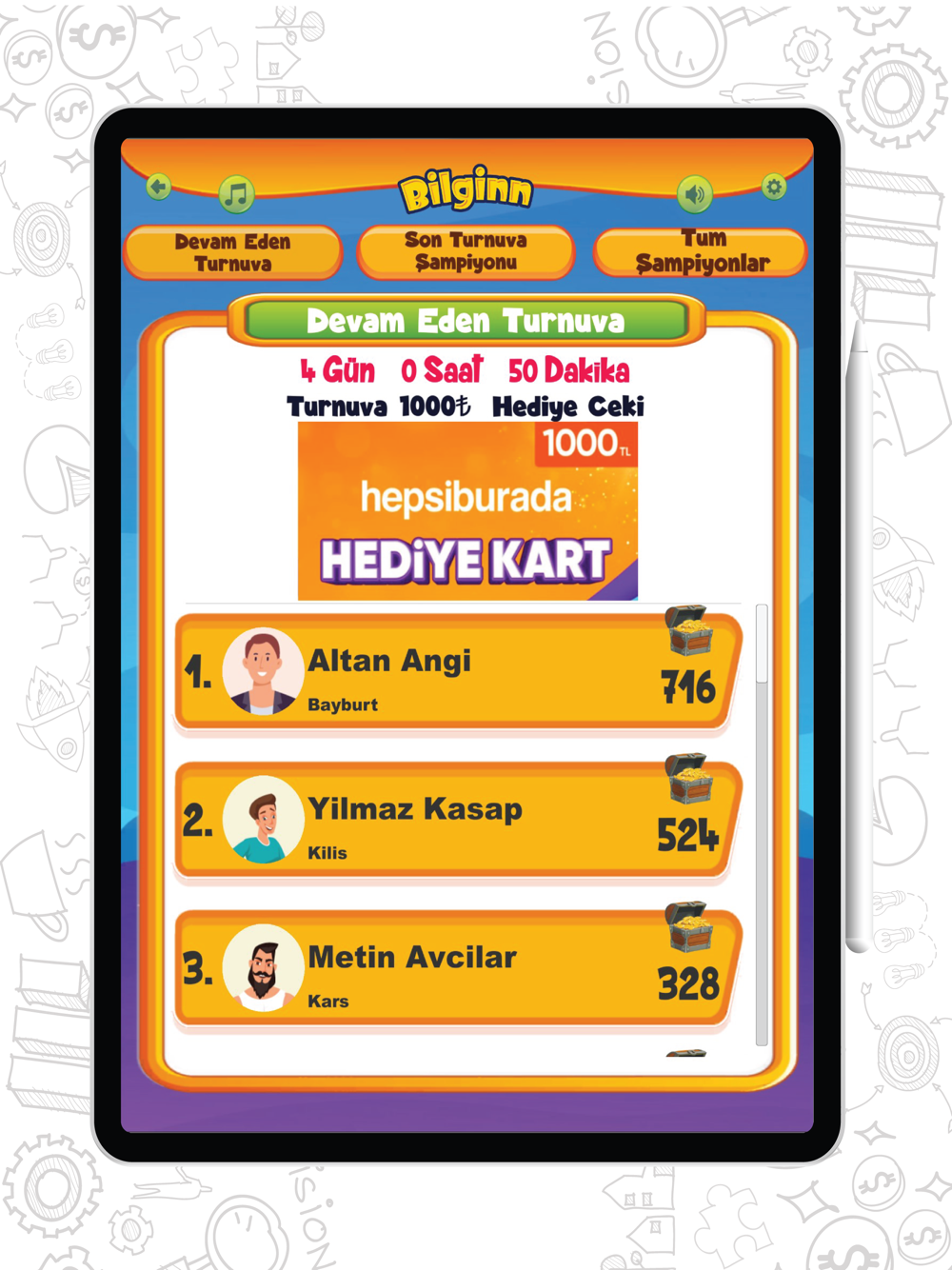 Turnuva Uygulama yöneticileri tarafndan oluşturulmaktadır. Turnuva başlangıç ve bitiş tarihleri arasında, odalardaki yarışmalarda kullanıcıların kazandıkları toplam altın sayılarına göre turnuva sıraları belirlenmektedir. Turnuva süresince en çok altın kazanan kullanıcı o turnuvanın şampiyonu olarak turnuva ödülünü kazanacaktır. Turnuva sonunda şampiyon olan kullanıcılarımızın mail adresleri üzerinden iletişim sağlanarak ödülleri iletilecektir.