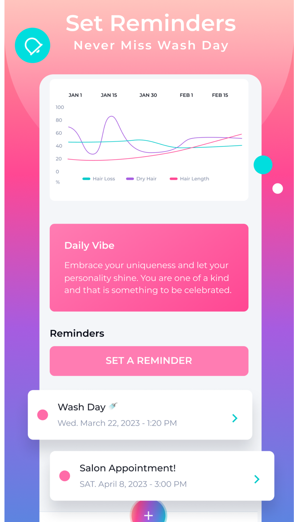 • Stay consistent with your hair care and wellness goals with daily reminders, notifications, and motivation.