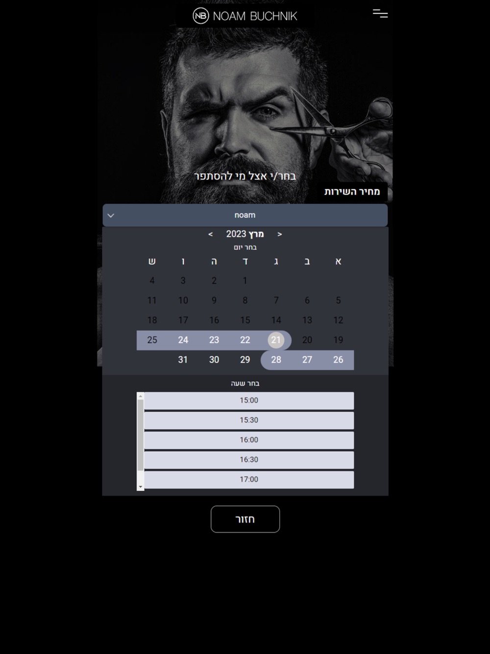 נועם בוחניק מזמין אותכם להגיע אלינו למספרה ולקבל חווית תספורת שעוד לא קיבלתם הקשבה לבקשת הלקוח,תוצאה ברמה מאוד גבוהה,התאמת תספורת לפני מבנה ראש הלקוח,הגיינה וחיטוי בין לקוח ללקוח כמובן,מוזיקה טובה אלכוהול,והכי חשוב תורים מסודרים באפלקציה נוחה ומהירה כל אחד מגיע ונכנס בזמן שהוא קבע מראש מחכים לכם על העמדה.
