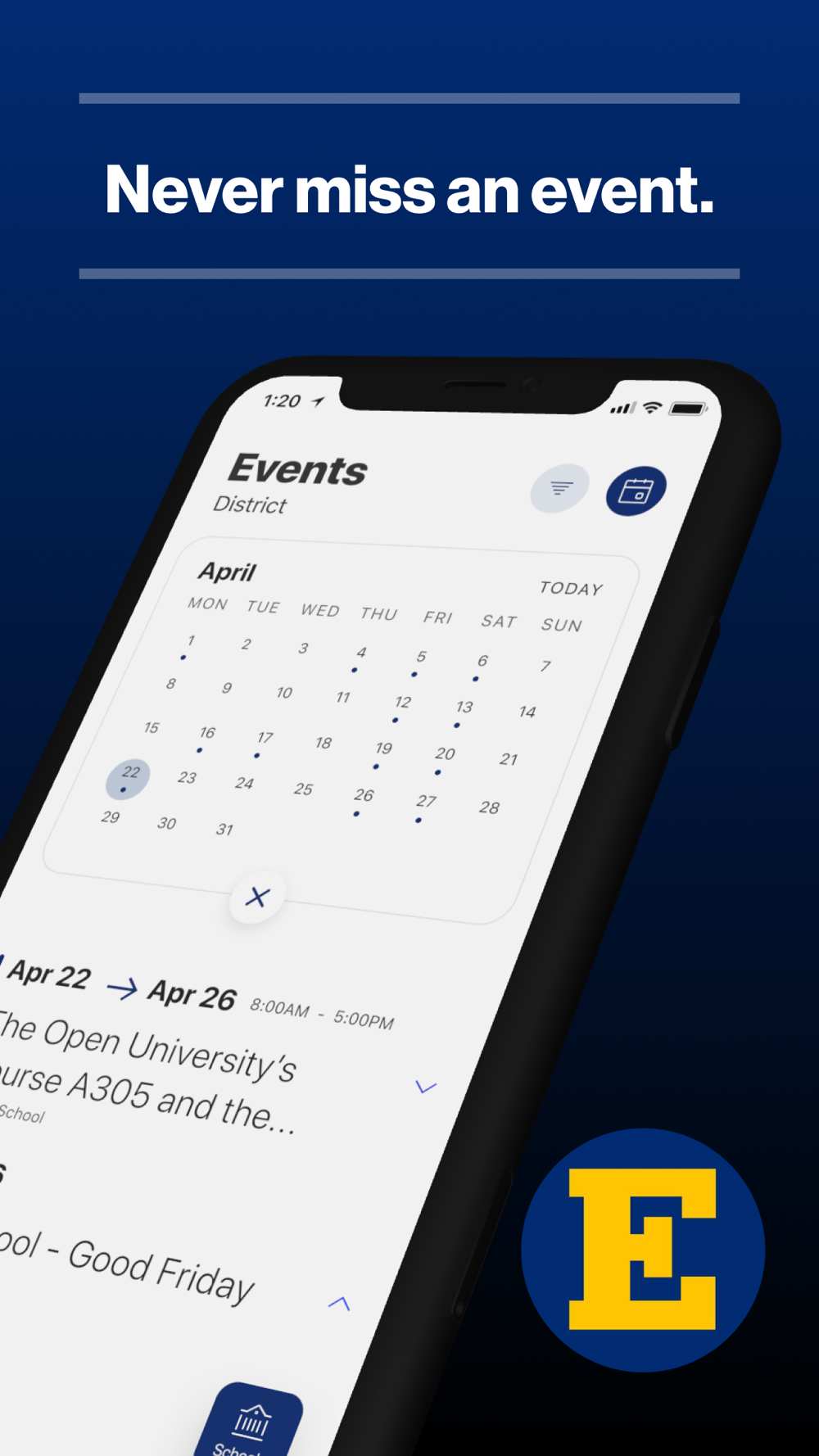 The event section shows a list of events throughout the district. Users can add an event to their calendar to share the event with friends and family with one tap.