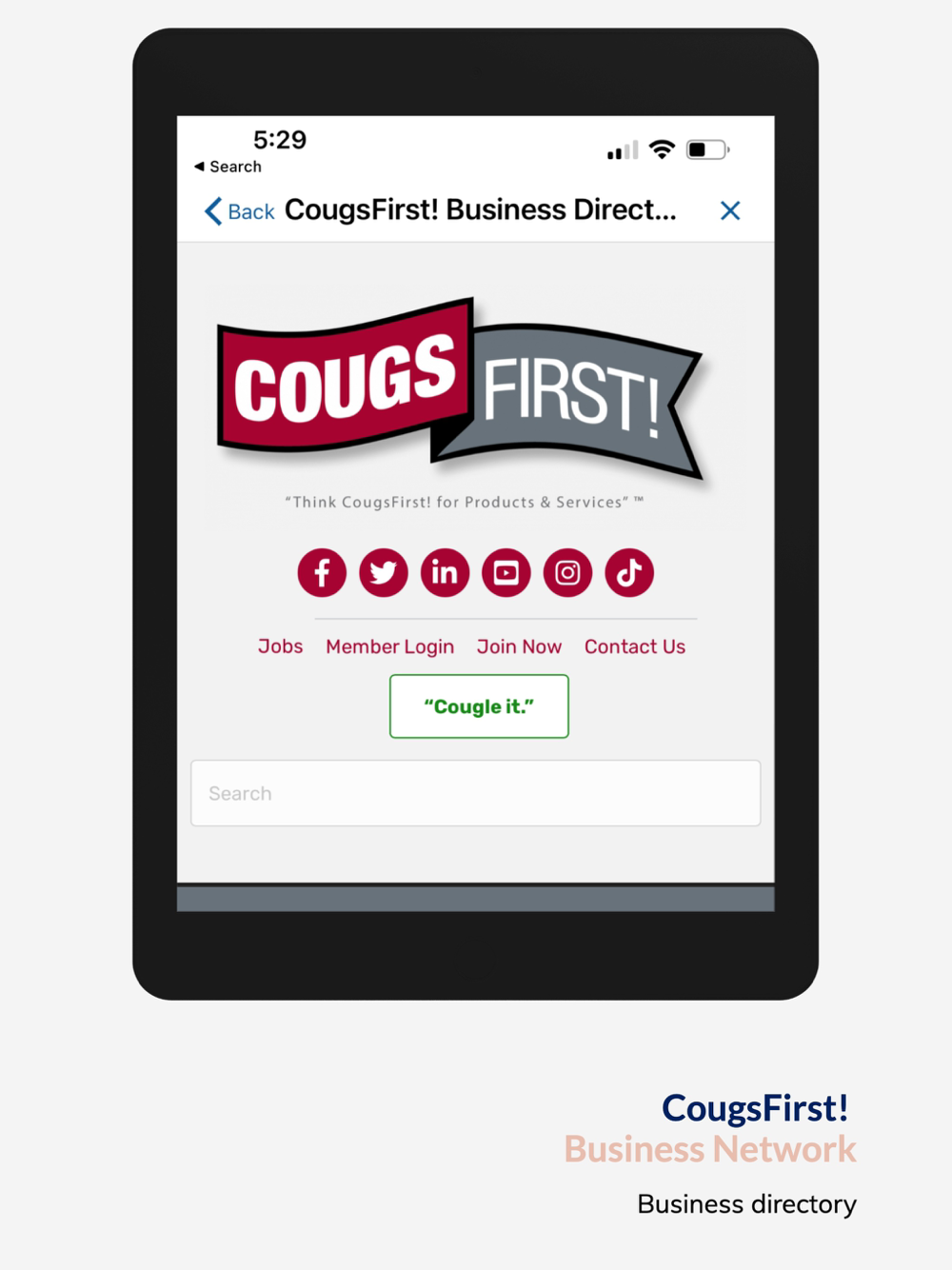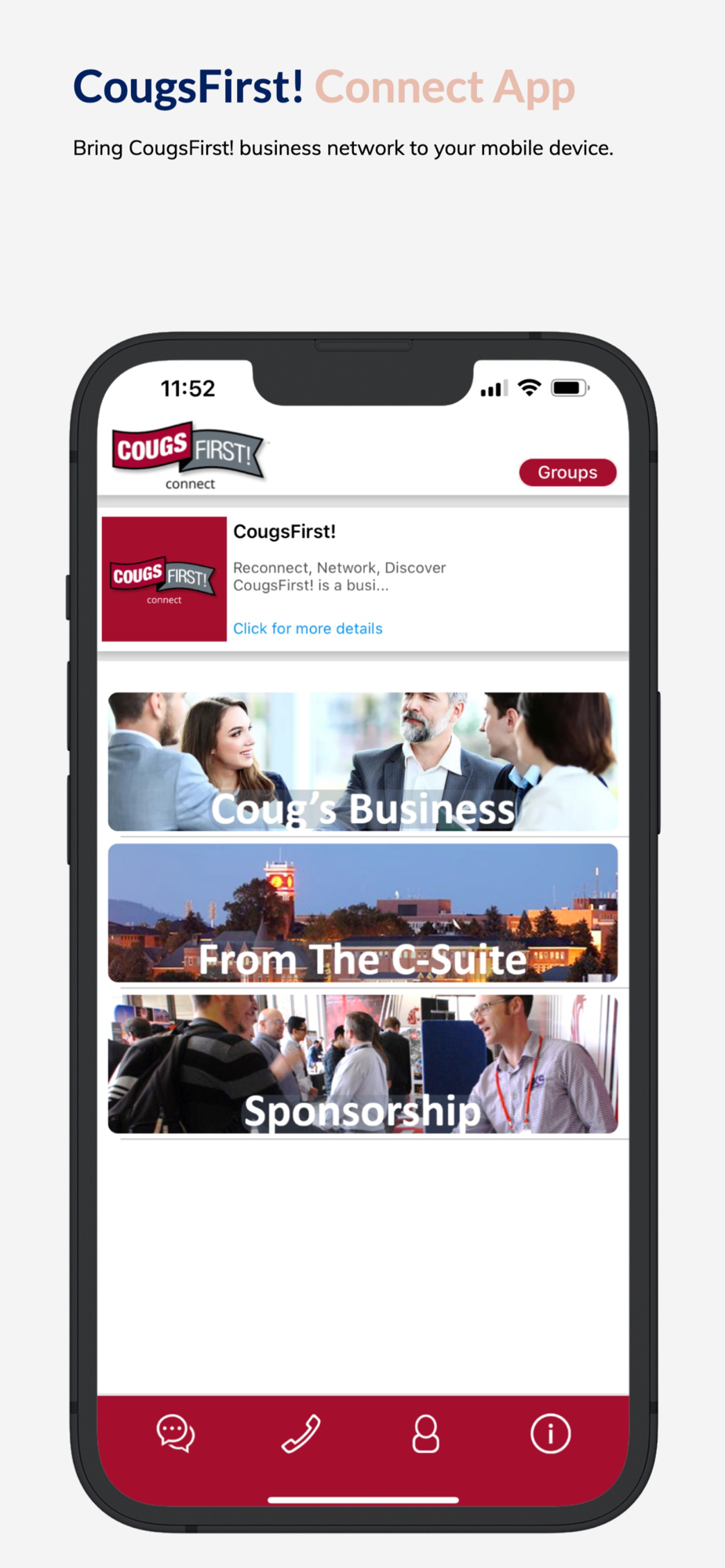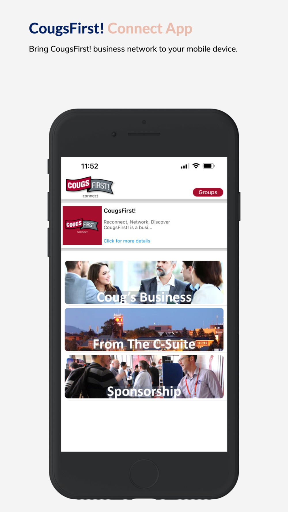 The CougsFirst! Connect app brings the CougsFirst! business network to your mobile device. You'll find our business directory, events, and exclusive promotions, plus have the opportunity to network with other WSU alumni, friends, and businesses.