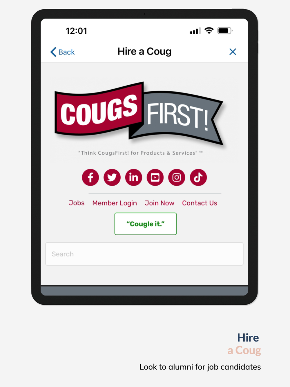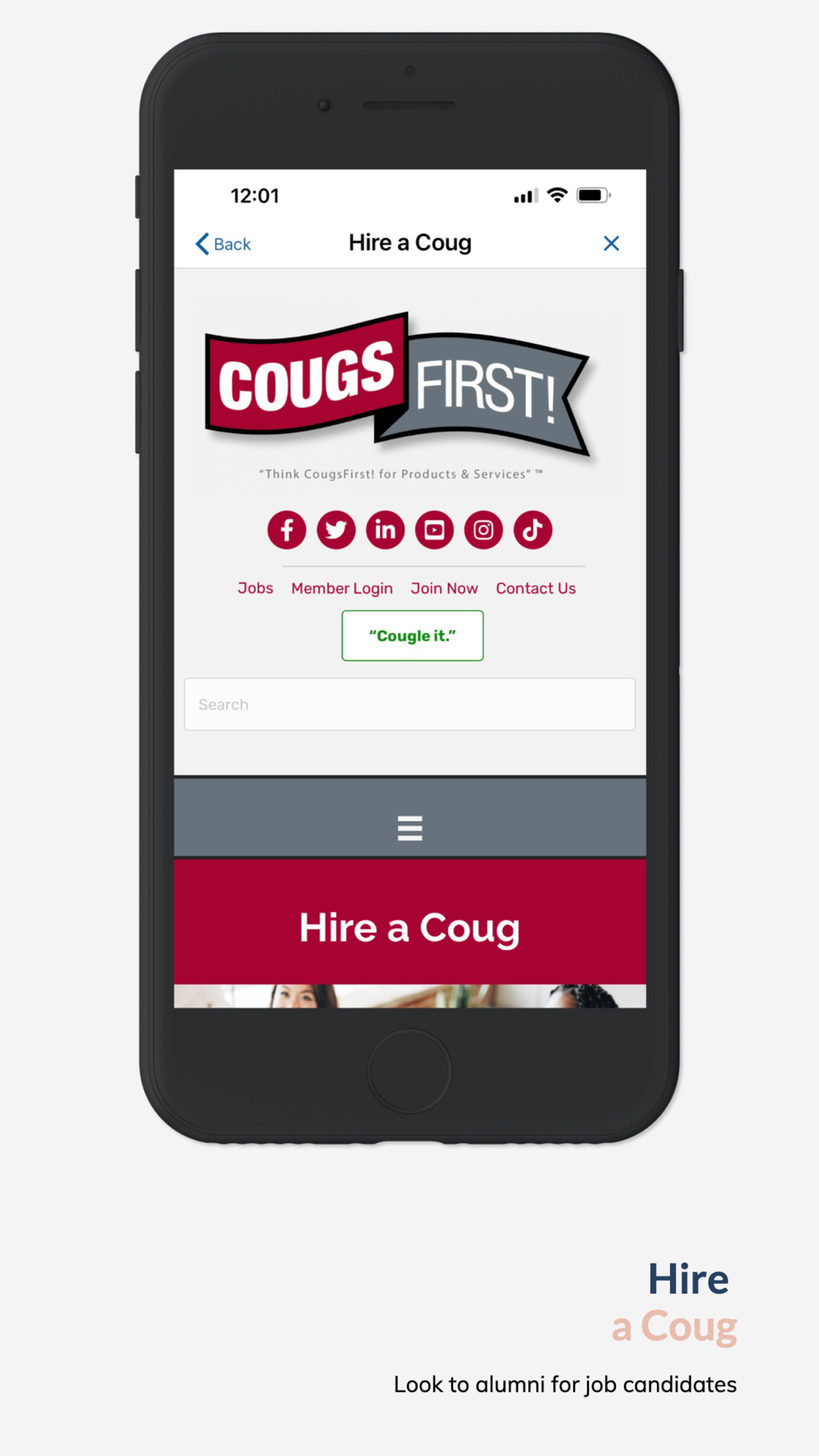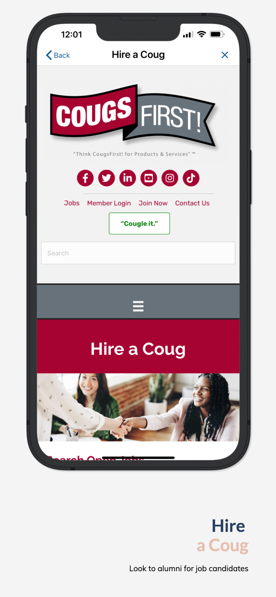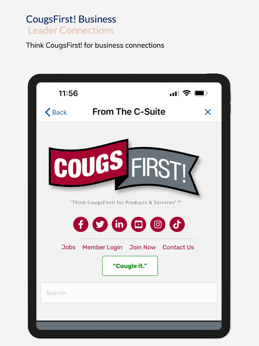 The CougsFirst! Connect app brings the CougsFirst! business network to your mobile device. You'll find our business directory, events, and exclusive promotions, plus have the opportunity to network with other WSU alumni, friends, and businesses.