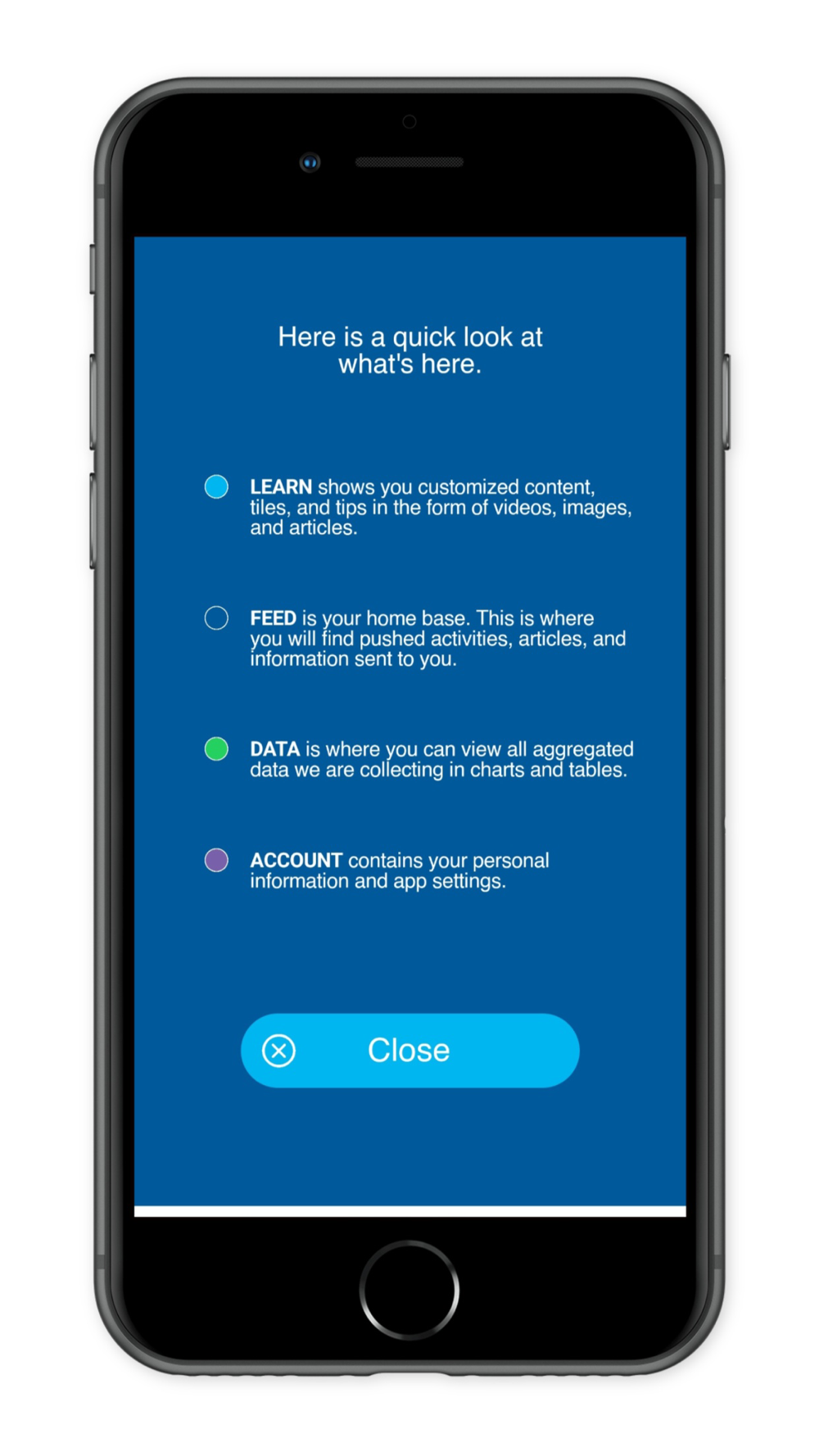 · Account (person icon) – here you will find your demographic information, be able to change your password, log out of the app, see what notifications you have enabled, see what data you are sharing, ask to be removed from the study, and send a question to our study team.