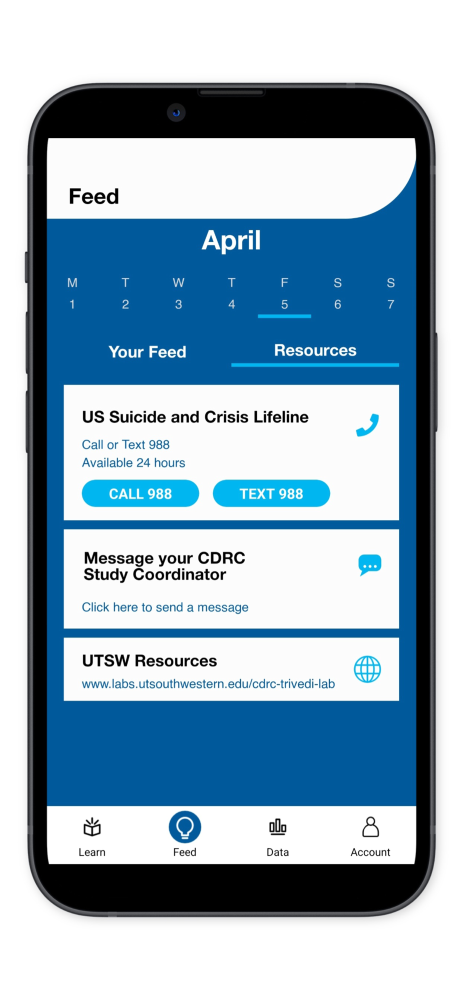 · Feed (lightbulb icon) – here you will find your daily surveys and tips under the “Your Feed” column. You will also find under the “Resources” column the US Suicide and Crisis Lifeline phone number, message box for sending an email to your Study Coordinator, and the link to our research site.