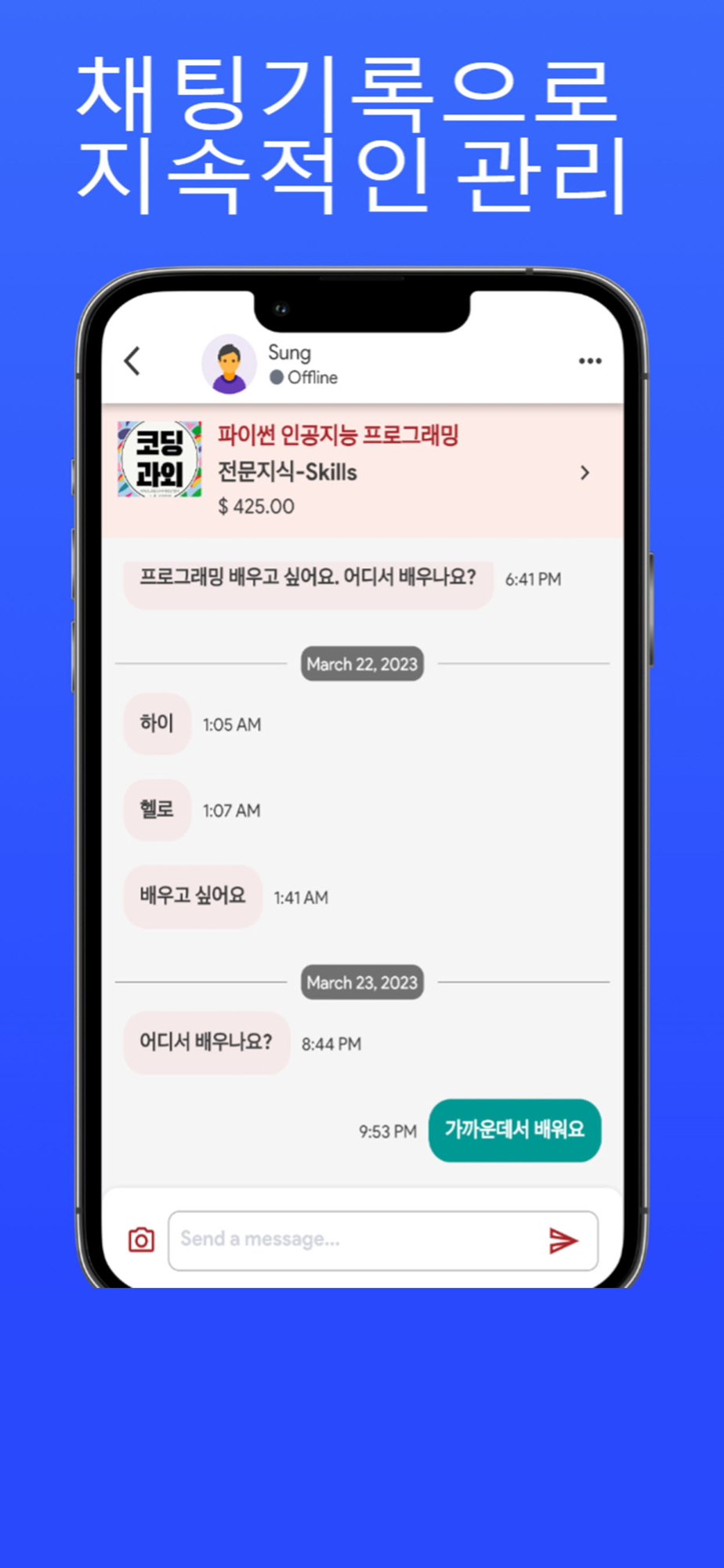 선생님은 이 앱을 통하여 학생과 1:1 채팅을 할 수 있습니다. 튜터링과 관련된 많은 정보를 물어보고 결정하세요