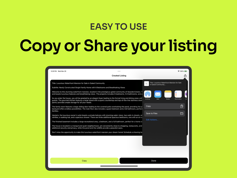 Introducing the ultimate real estate listing AI creator for realtors! With our powerful tool, you can easily create professional and stunning real estate listings in just a few taps.