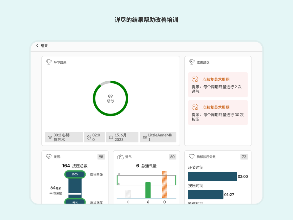 导师可用的新功能:支持最新全球复苏指南,培训后表现深入报告,基于模拟人的学员重命名和安排,重新设计CPR游戏以支持促进最佳品质,而不是速度。支持在小婴儿QCPR上达成婴儿窒息学习目标。