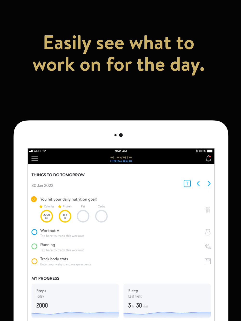 With the Elevate Fitness & Health App, you will have access to workout programs designed specifically to help you reach your fitness and health goals! You can follow & track your workouts, your nutrition, your lifestyle habits, measurements and results–all with the help of your coach.