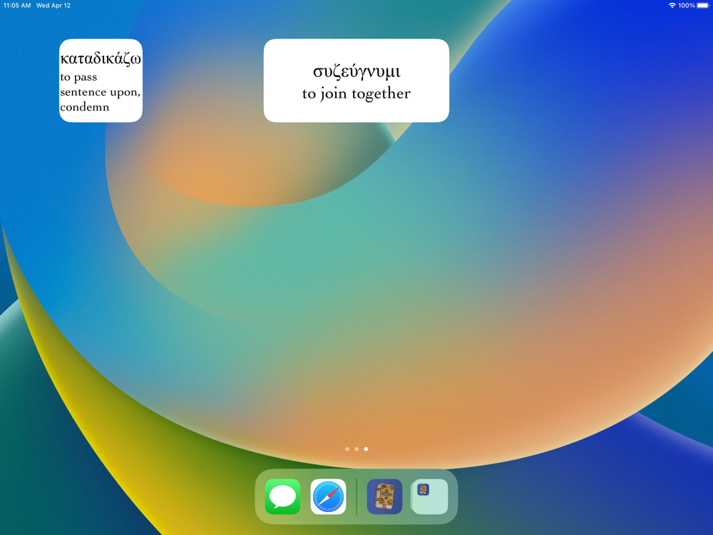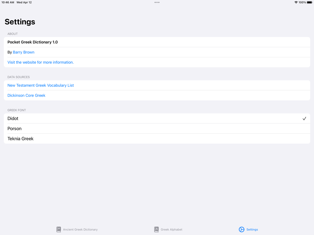 Quickly look up Ancient Greek words with the Pocket Greek Dictionary! The dictionary includes over 5,000 words of Ancient Greek. You can search for words in English or in Greek. Searching in Greek ignores the diacritics which makes it quick and easy to find the word you are looking for. The Greek text font is customizable from the Settings screen inside the app. A Greek Alphabet screen displays the Greek letters for quick review and the app will speak the name of the Greek letters when you tap on them. A Word of the Day Widget is also available, allowing you to add a Word of the Day to the Home screen or Lock screen. The default update frequency of the Word of the Day widget is once per day, but it can be customized to update more frequently.
