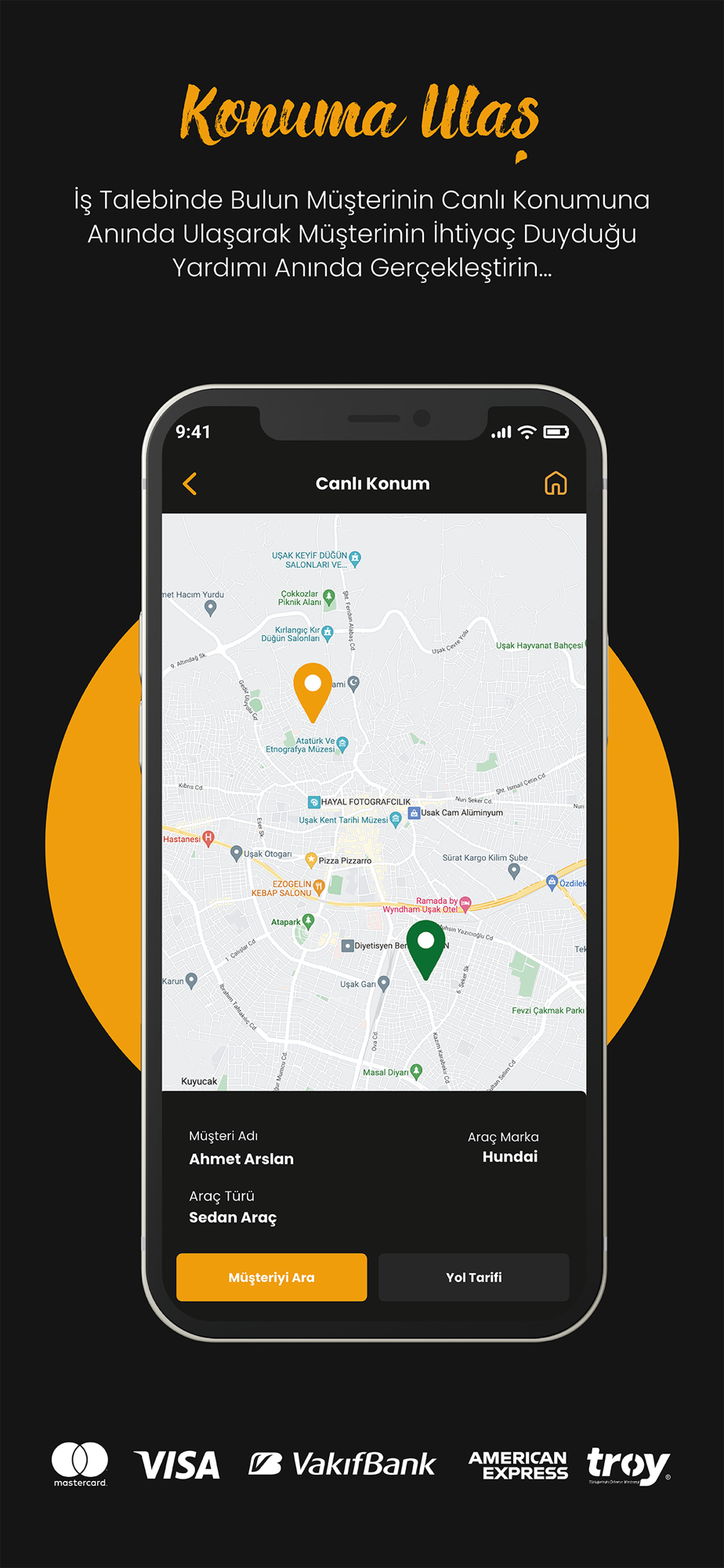 "YOL HİZMETİ" mobil uygulamasını telefonunuza indirin ve uygulamaya kayıt olun. Ardından ihtiyaç duyduğunuz her an Türkiye'nin dilediğiniz yerinde uygulama üzerinde almak istediğiniz yol yardım hizmetini seçin, konumunuzu belirleyin ve en yakın yol yardım ekibimiz en kısa sürede size ulaşsın.
