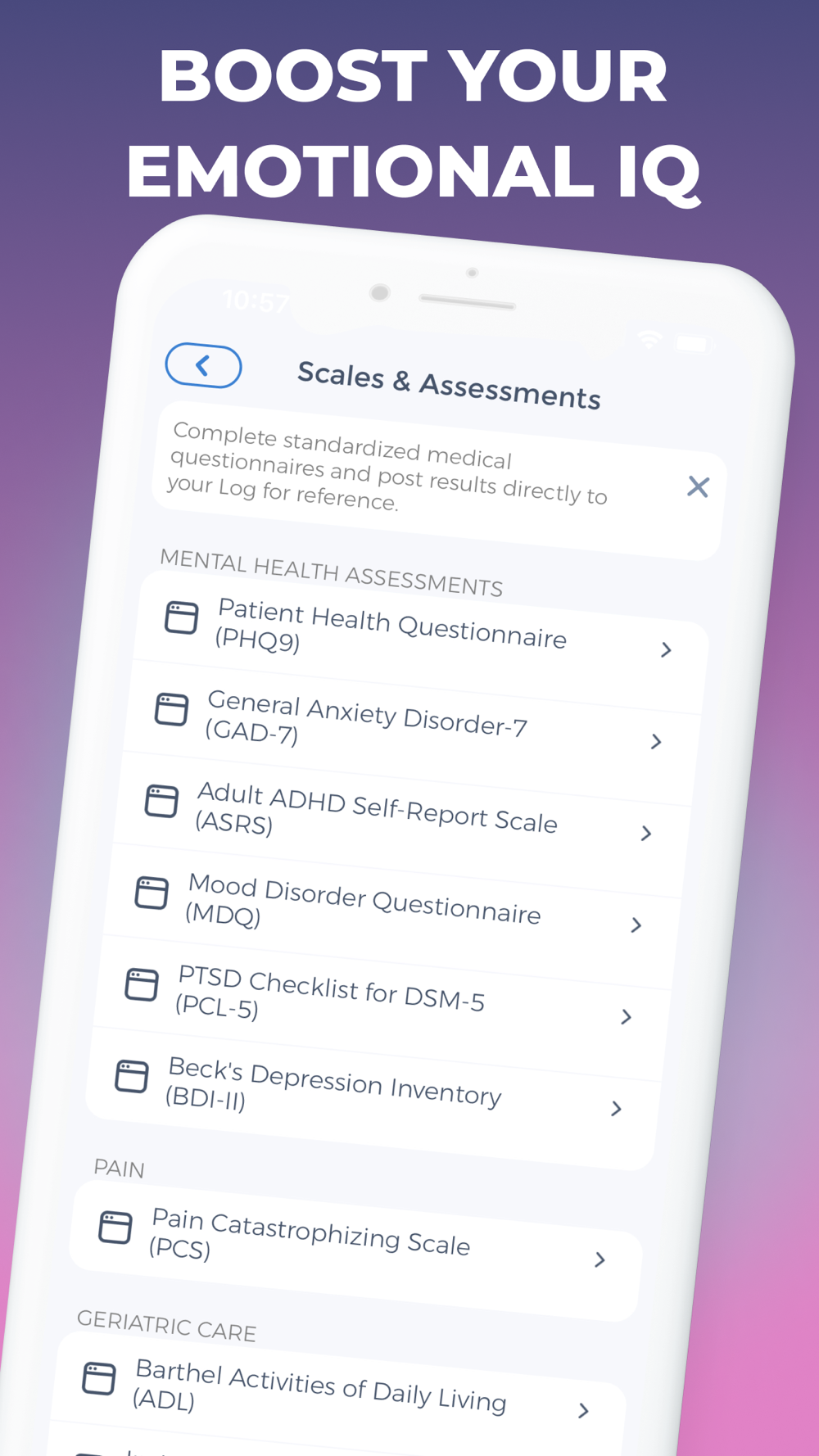 Complete clinically-validated questionnaires to help you better understand your mental health conditions and track your progress over time. Our app includes:
