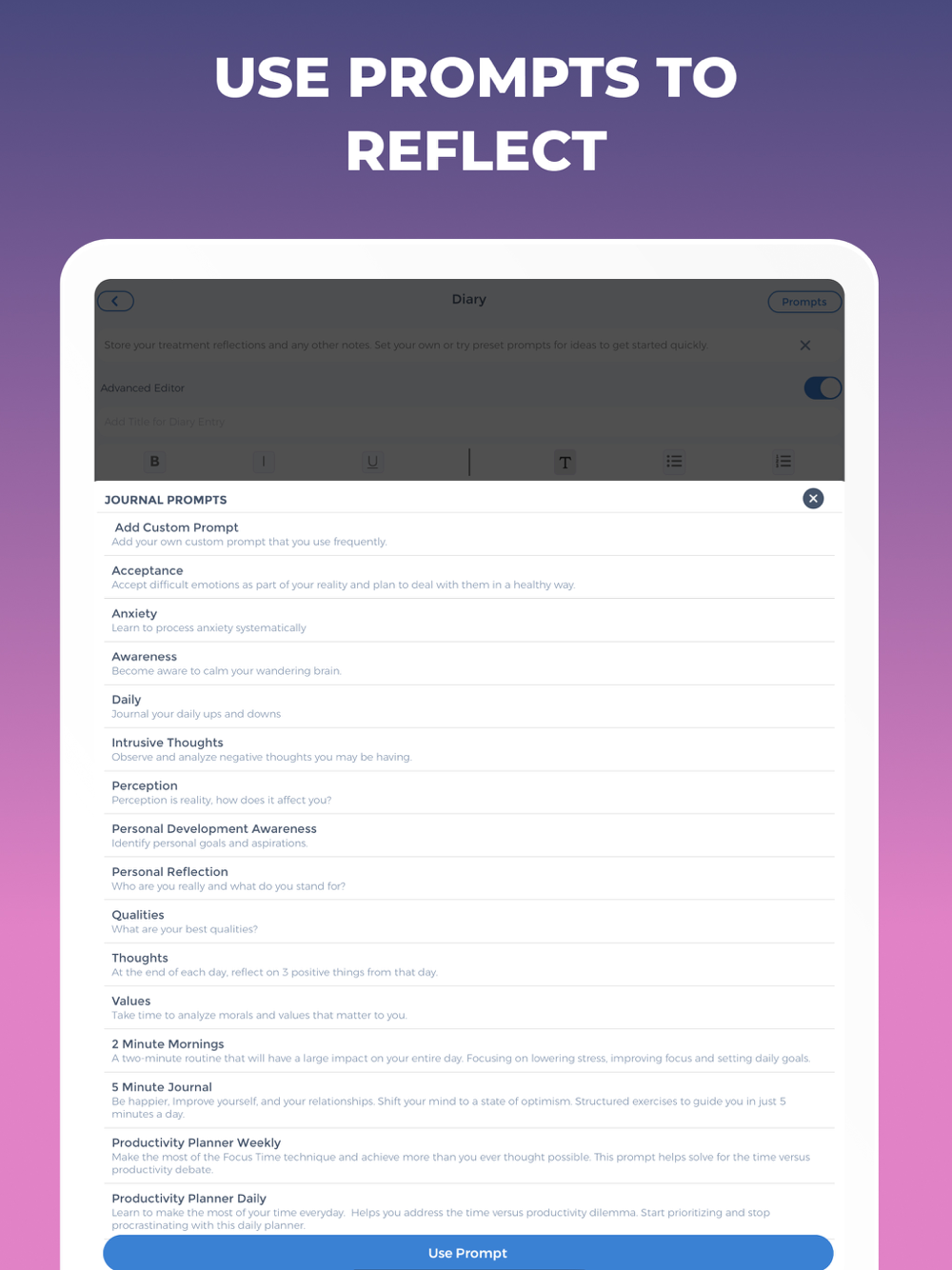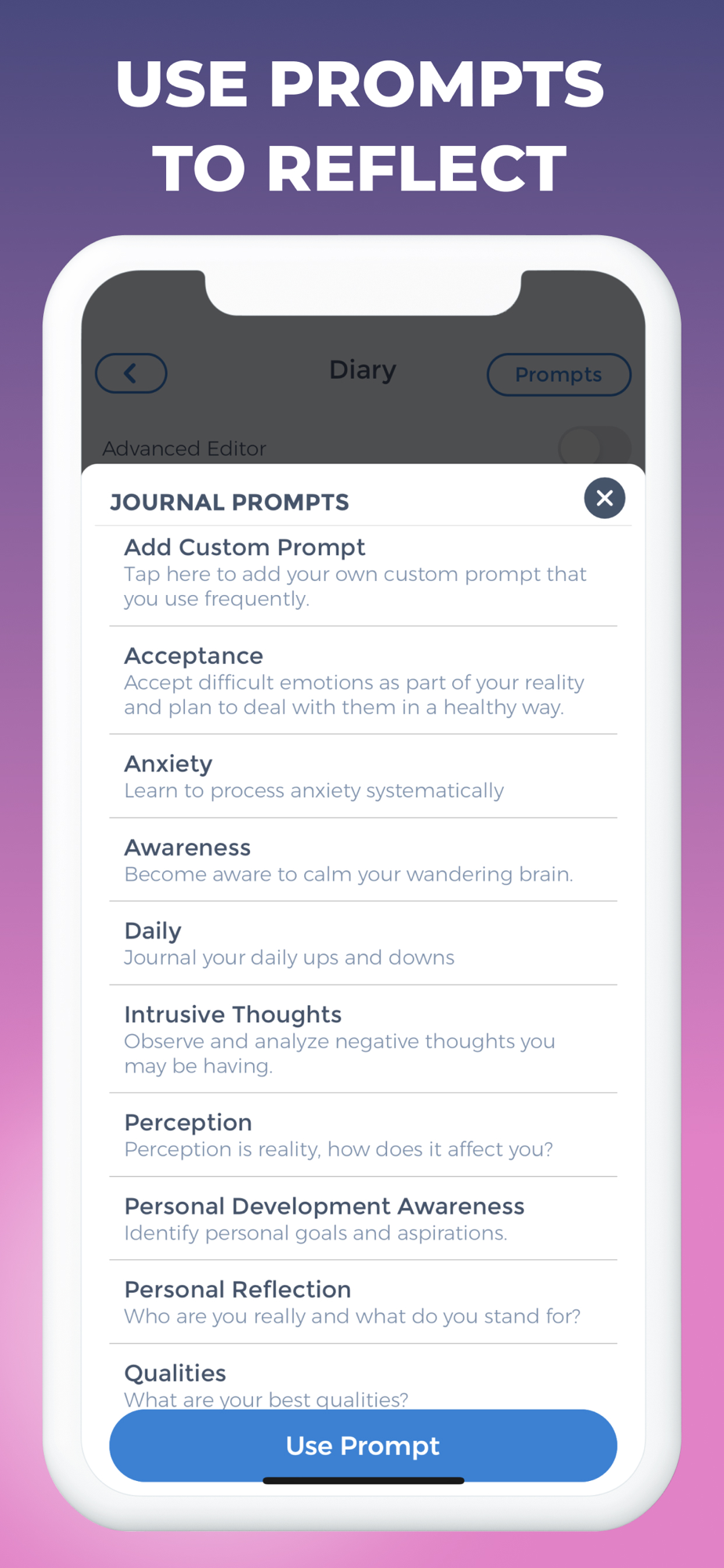 Our app provides guided journaling prompts to help you explore and express your emotions, supporting you in your journey to self-discovery and emotional well-being. Example prompts include, "What made you feel grateful today?" or "How did you cope with a challenging situation?"