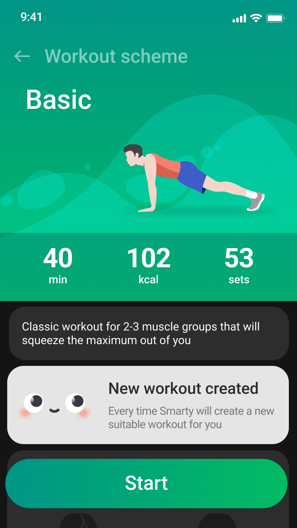 Our AI understands your body composition, tracks your progress, and adjusts your workouts accordingly. Smarty Assistant provides four types of workouts: basic, short, yoga, and stretching to keep you engaged and motivated. Just choose a workout type depending on your mood, and Smarty will select the best option for you based on your goals and fitness level.
