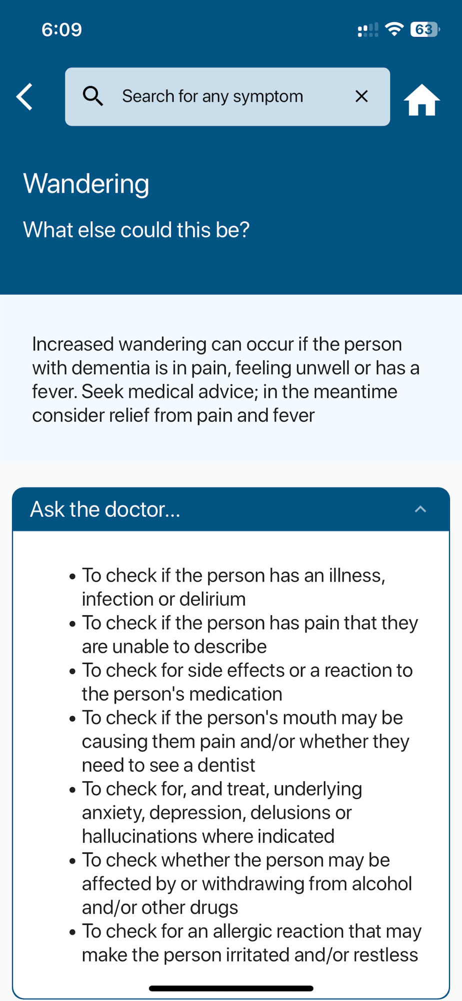 This app was developed to provide a quick reference guide which will assist carers when they are presented with behaviours and psychological symptoms associated with dementia. This app is provided for general information only and does not claim to reflect all considerations. As with all guidelines, recommendations may not be appropriate for use in all circumstances.