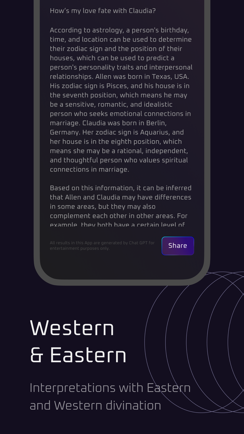 -Western: Our Western predictions are typically based on astrological theory, using Greek mythology and palace theory to calculate zodiac signs and birth charts, and analyzing the positions of planets such as Uranus, Neptune, and Pluto to predict individuals' personality traits, fate, and future.
