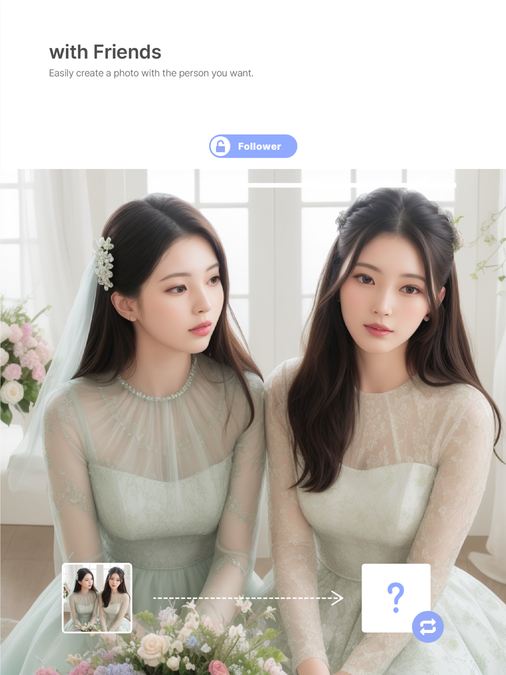 Meet with friends through follow and follower features. You can establish a friend relationship by sending a follow request. Followed users can use your face data to create AI photos. If your friend uses your face data, you will receive a notification and the photo will be tagged in their profile. To find a new friend's account, use the user ID or QR code.
