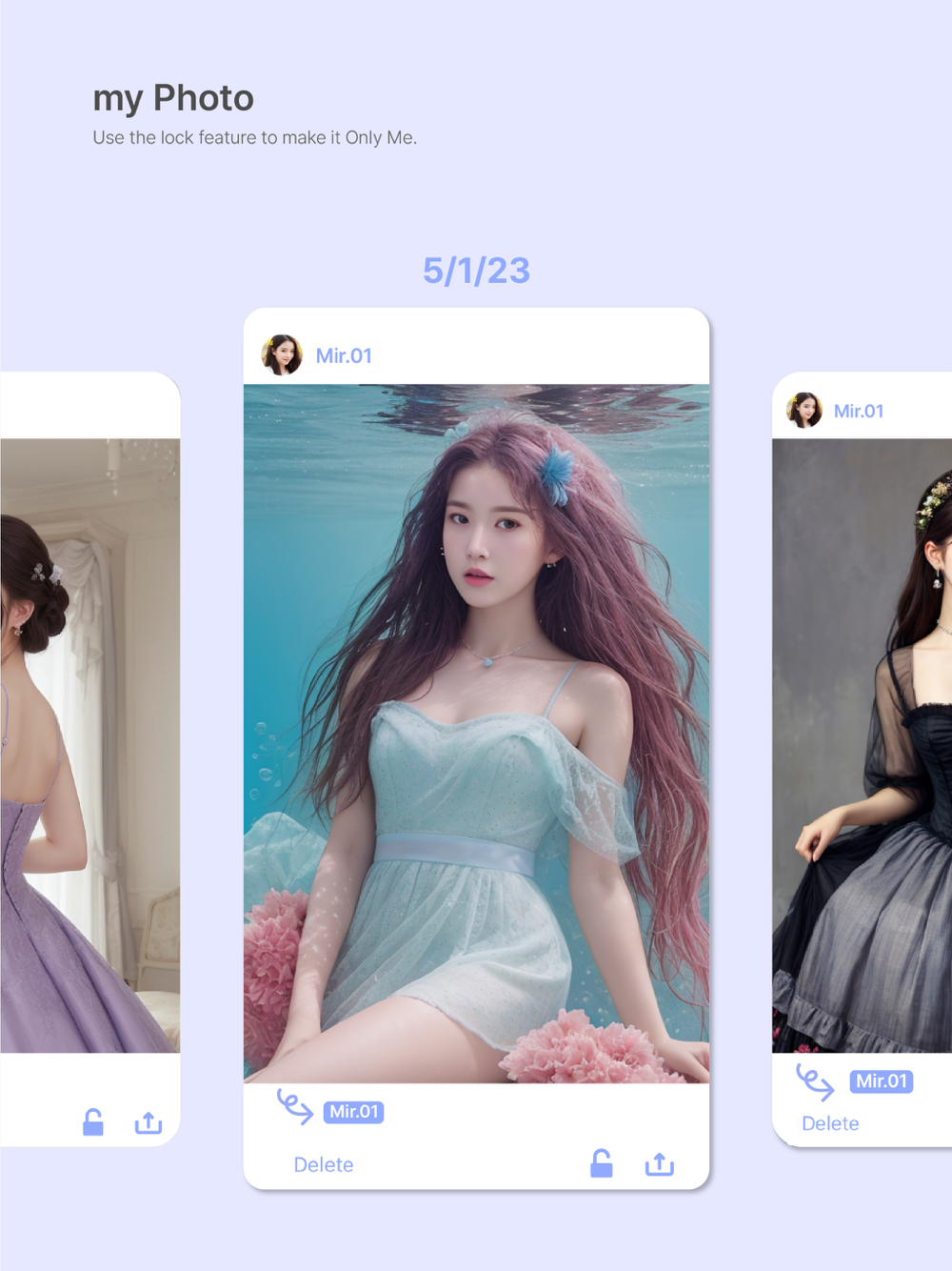 The AI photos that you have created or tagged will be displayed. All photos can be changed to 'Only Me' through a lock feature. Photos that are not locked will be visible to followers only and will not be public to users who are not following.