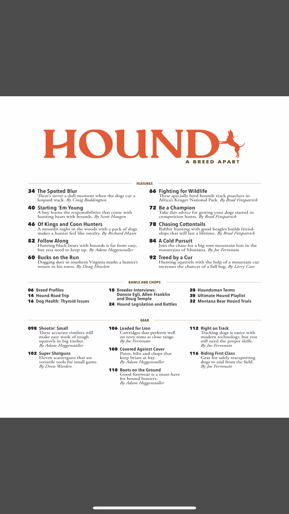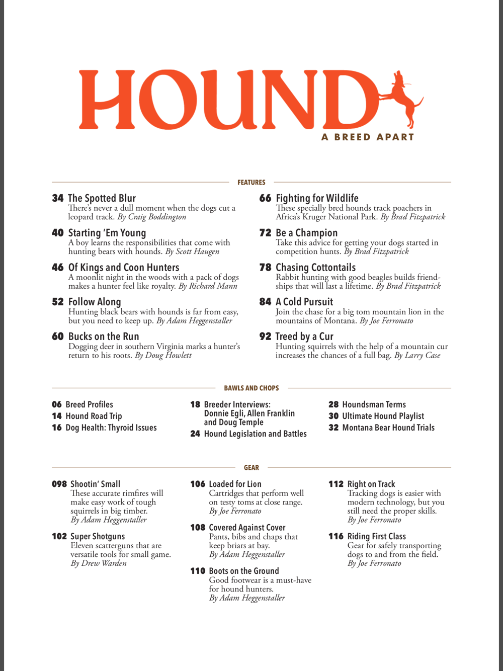 Few sounds beckon hunters to the field with as much urgency as the voice of a hound on the trail of game. Those chops, bawls and bays have promised adventure and extolled the bonds between man and dog for centuries. Come join the race with Hound, the premier publication devoted to one of the most traditional and celebrated, yet sometimes misunderstood, styles of hunting today. Hound examines breeds that trail game from bears and leopards to rabbits and raccoons, gathers insight from the folks who devote their lives to working with these amazingly athletic dogs, and honors the unique culture surrounding the chase.