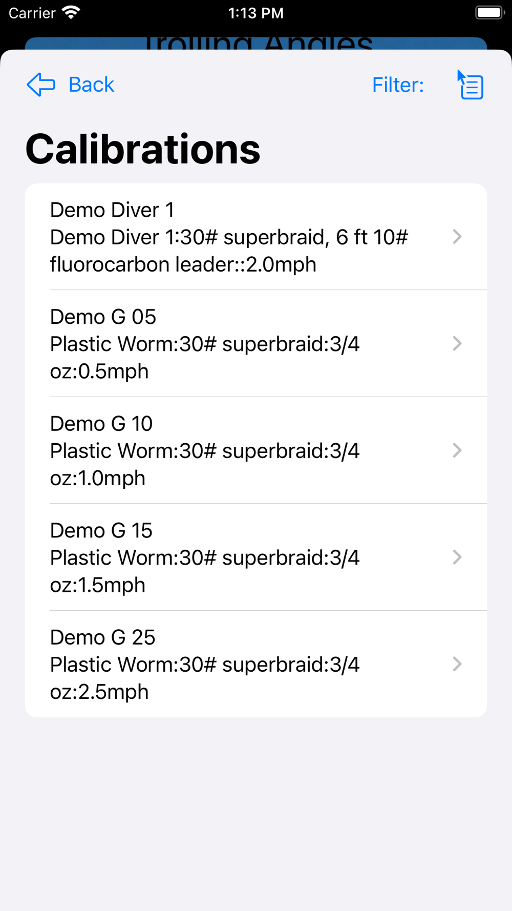 In a trolling phase, after calibration and analysis, the angler specifies the desired depth, and the app uses the curve data structure to look up and display the line length which is required to troll at that depth.