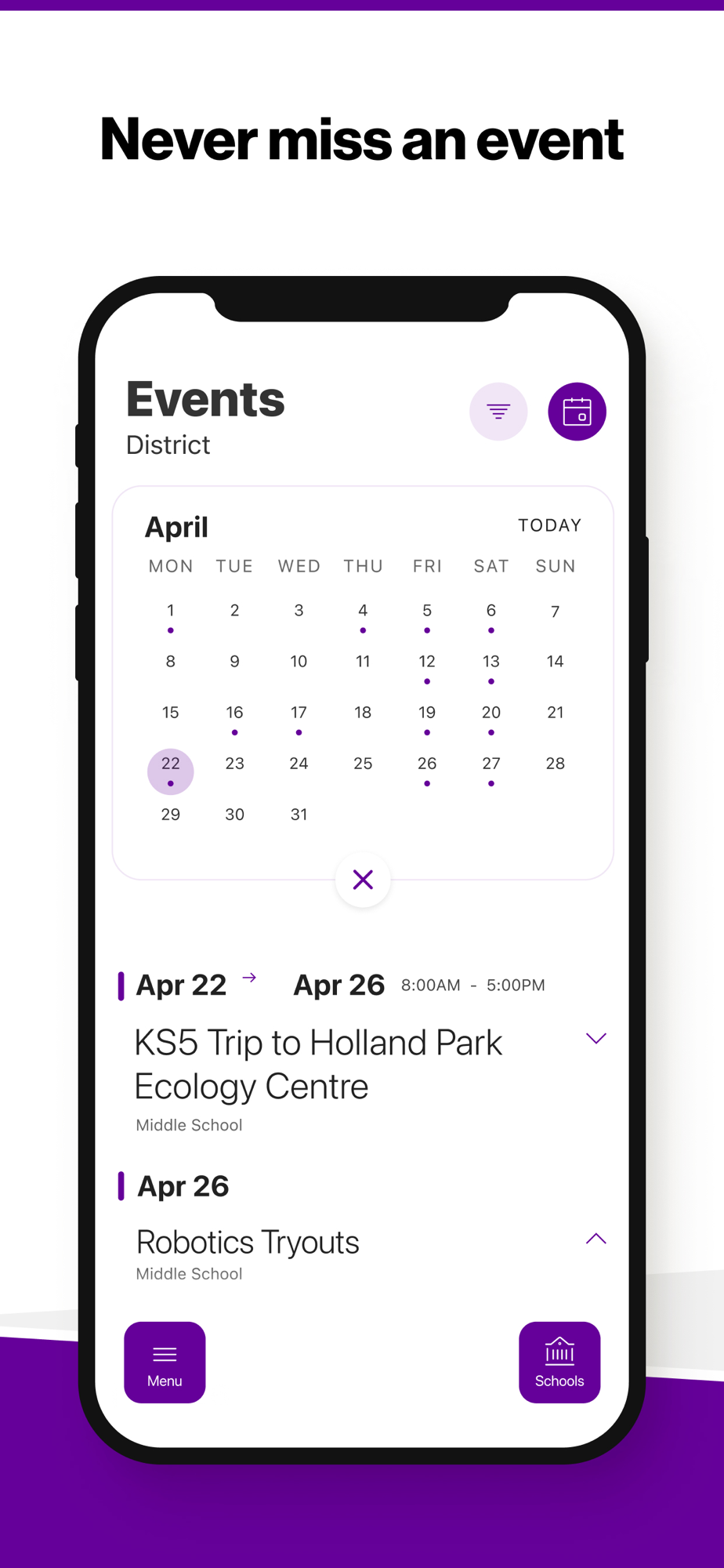 The event section shows a list of events throughout the district. Users can add an event to their calendar to share the event with friends and family with one tap.