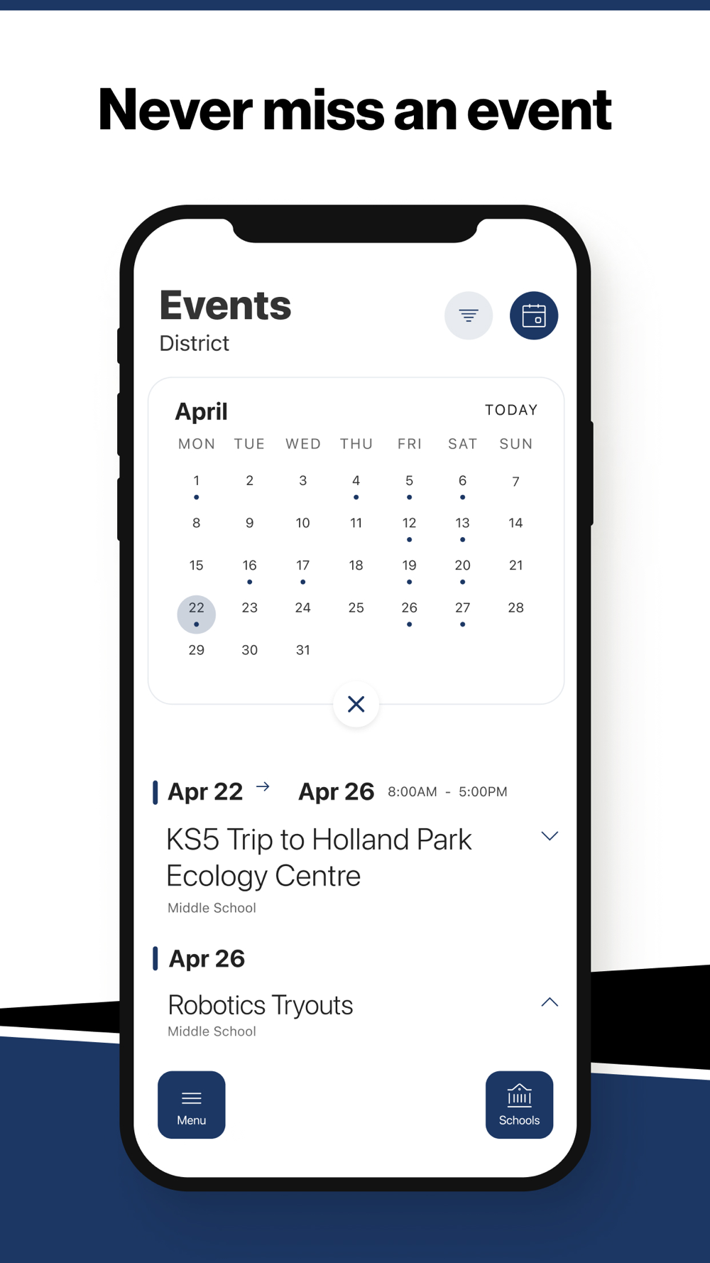 The event section shows a list of events throughout the district. Users can add an event to their calendar to share the event with friends and family with one tap.