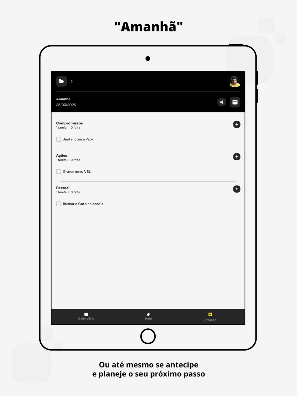 Você terá todas as suas tarefas do dia mapeadas por importância e seguindo a lógica do 3-3-3: compromissos, ações, pessoal e backlog.