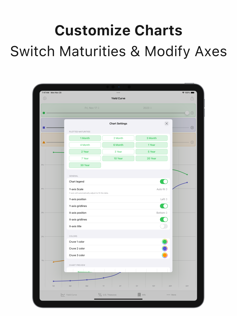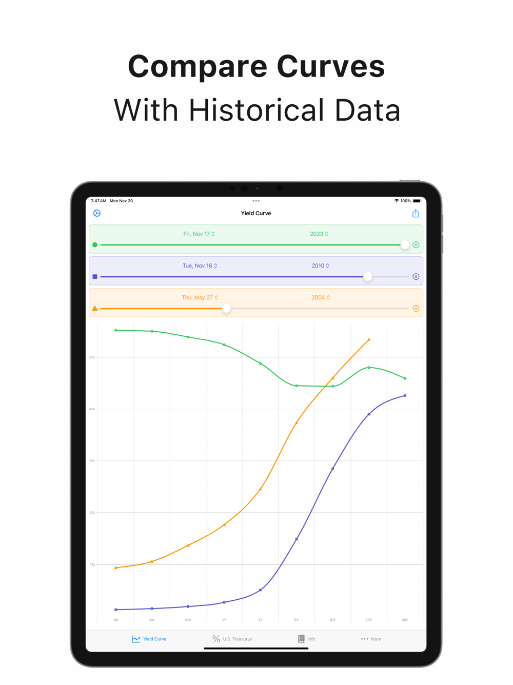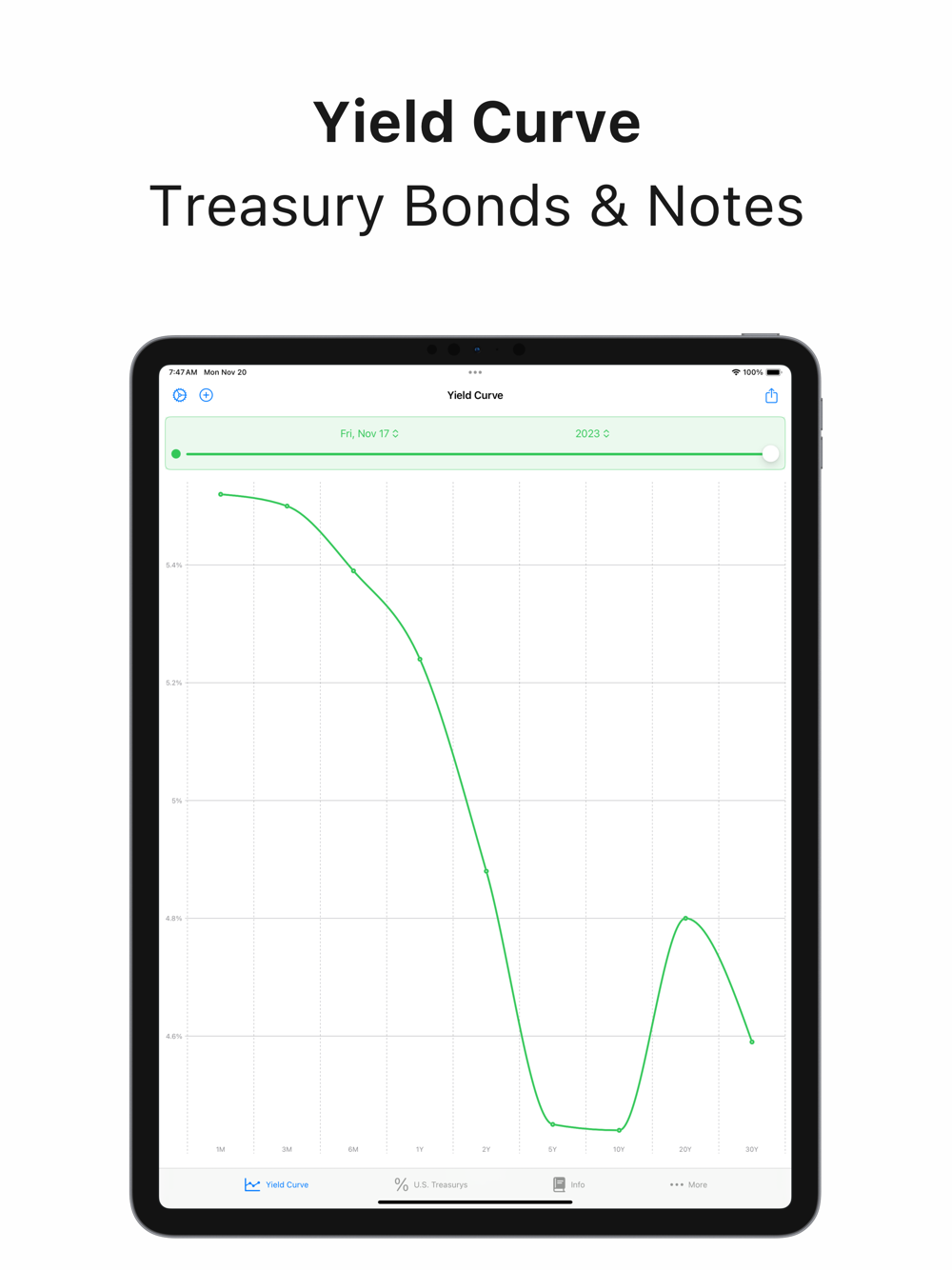 The Treasury Yield Curve Tracker is a simple app that allows users to view and analyze the current shape of the US treasury yield curve. The app offers a range of customizable features including the ability to quickly adjust the time period and compare historical yield curve shapes side by side.