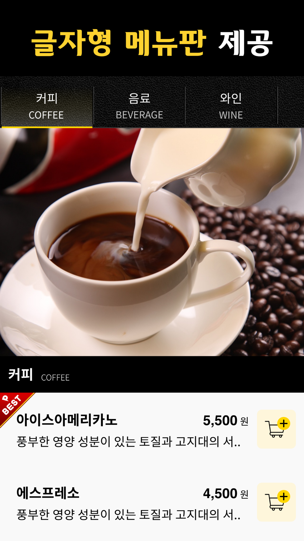 - 메뉴판 색상 성택 : 3가지 색상 중 하나 선택(블랙 색상 기본)