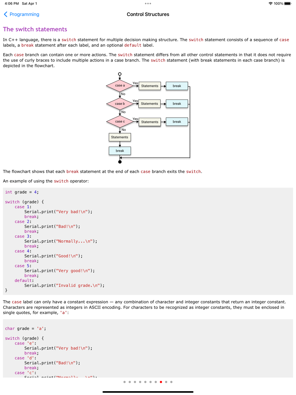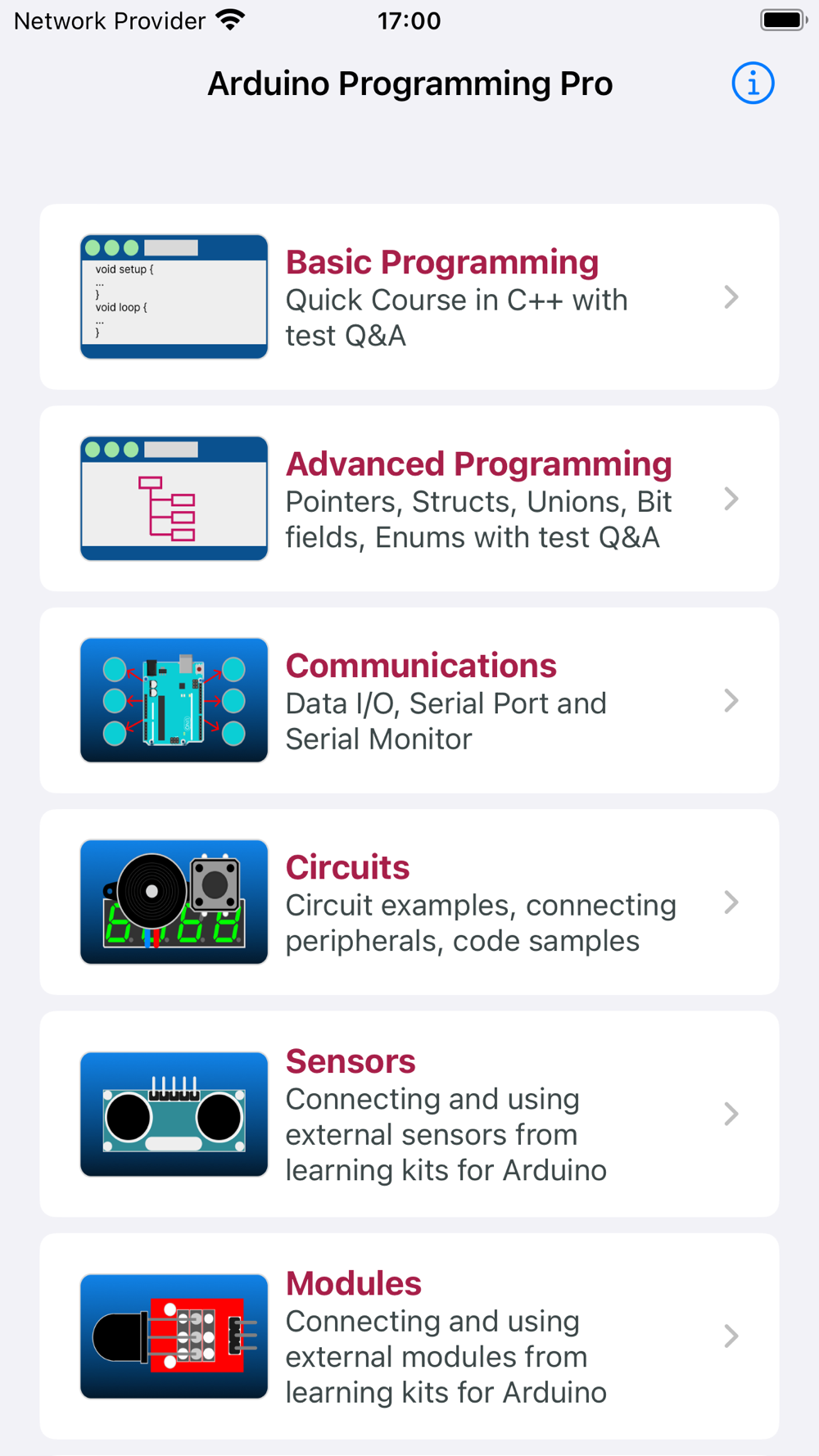 This big tutorial contains quick C/C++ programming course, more than 200 lessons, guides and examples. It also contains test questions and answers for learning Arduino programming which can be used to prepare for interviews, tests and exams. Application content has been translated into the following languages: English,French,German,Portuguese,Russian,Spanish. Arduino boards can be connected to various electronic components, sensors and modules. They are used in a wide variety of circuits and automation projects. This application contains reference for various peripheral electronic components, analog and digital sensors and external modules for Arduino: their description, usage, integration and code examples. Programming guide contains following themes: - Data types - Constants and literals - Operations - Typecasting - Control Structures - Cycles - Arrays - Functions - Variable scopes and storage classes - Strings - Pointers - Structs - Unions - Bit fields - Enums - Preprocessor directives - Test questions/answers - Serial Port functions and samples - Serial Monitor usage This application contains following hardware examples: - LEDs, digital outputs - Buttons, digital inputs - Serial port - Analog inputs - Analog outputs - LED displays - Intergated circuits - DC Motors - Timers - Sound - Ambient light sensors - Measuring distance - Vibration sensors - RFID sensors - Temperature and humidity sensors - Rotary encoders - Sound modules - Displacement sensors - Infrared Sensors - Magnetic field sensors - Touch sensors - Tracking sensors - Flame detectors - Heartbeat sensors - LED modules - Buttons and joysticks - Relays App content are updated in every new version.
