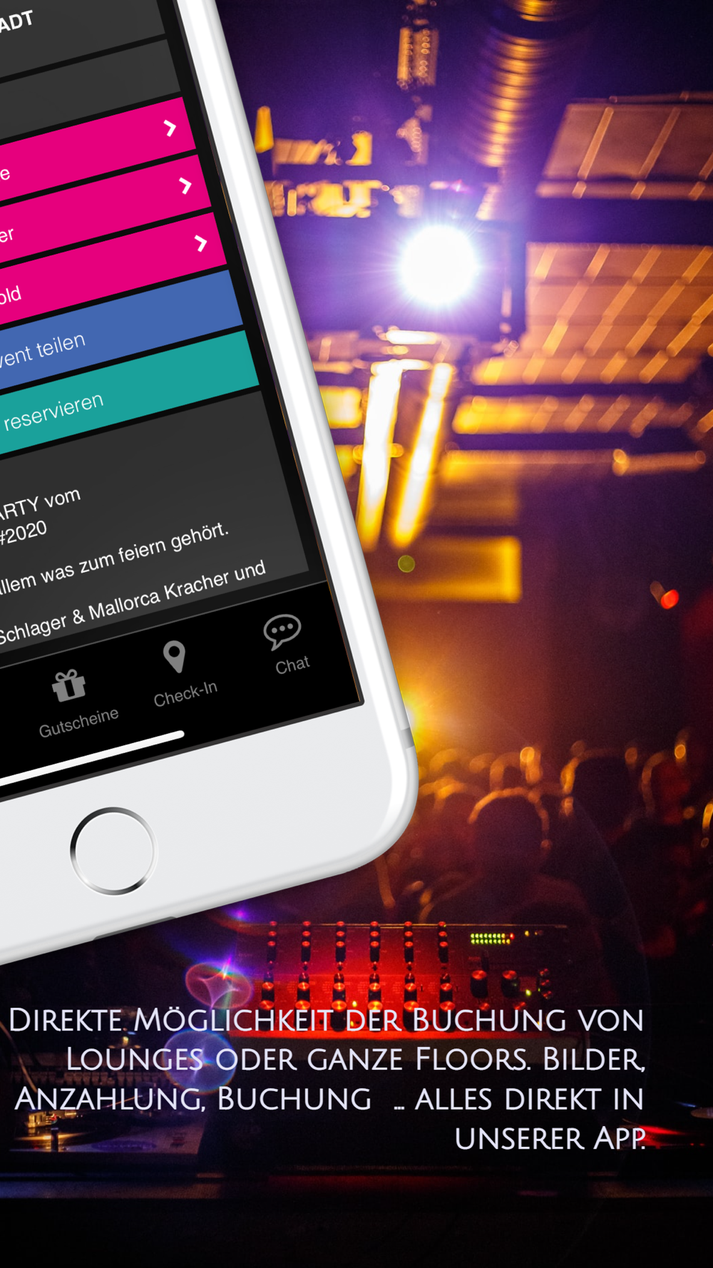- Erfahre mehr über unsere geplanten Events, besondere Öffnungstage, Musikrichtungen, DJs, besondere Services, buchbare und freie Lounges und Tickets