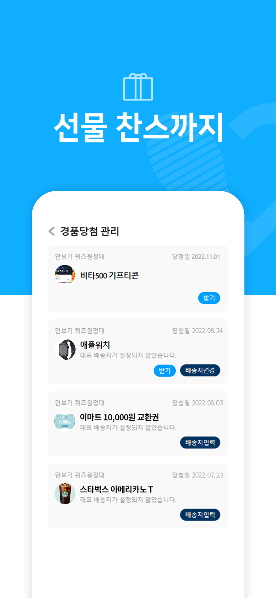 • 만보기 기능은 기본. 10,000 걸음을 달성하면 100포인트 지급, 100% 경품 당첨이 되는 퀴즈도 풀 수 있어요.