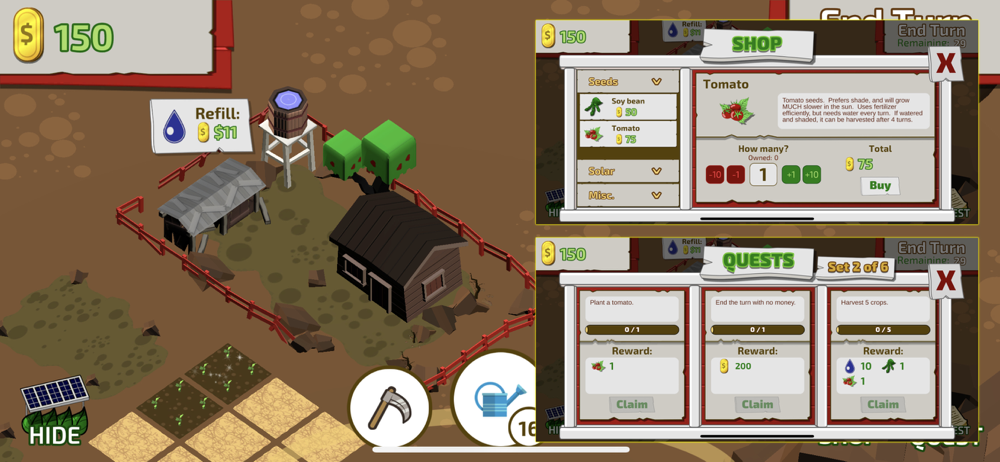 An educational game focused on the emerging concept of agrivoltaics in collaboration with a team of University of Illinois Urbana-Champaign researchers. The game is designed to inspire future farmers to think differently about solar power by teaching kids about the combination of agricultural production and solar photovoltaics. Unlike other farm simulation games that gamify all aspects of running a farm, this app will focus on the interaction between crops and solar panels, backed by science from the growing niche of research into the effects of solar panel placement on crop growth.