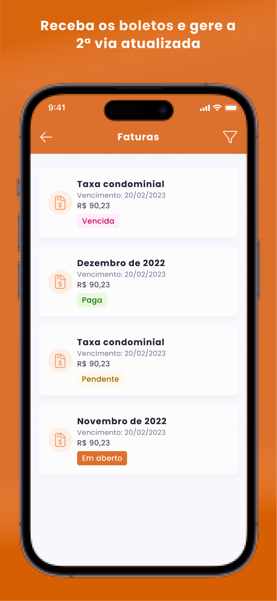 • FATURAS: Receba a taxa condominial pelo app e com 1 clique copie o código de barra para pagar em seu Internet Banking. Venceu? Sem problemas: gere a 2ª via e pague na hora! Chega de boletos em baixo na porta ou horas no telefone para gerar uma 2 via.