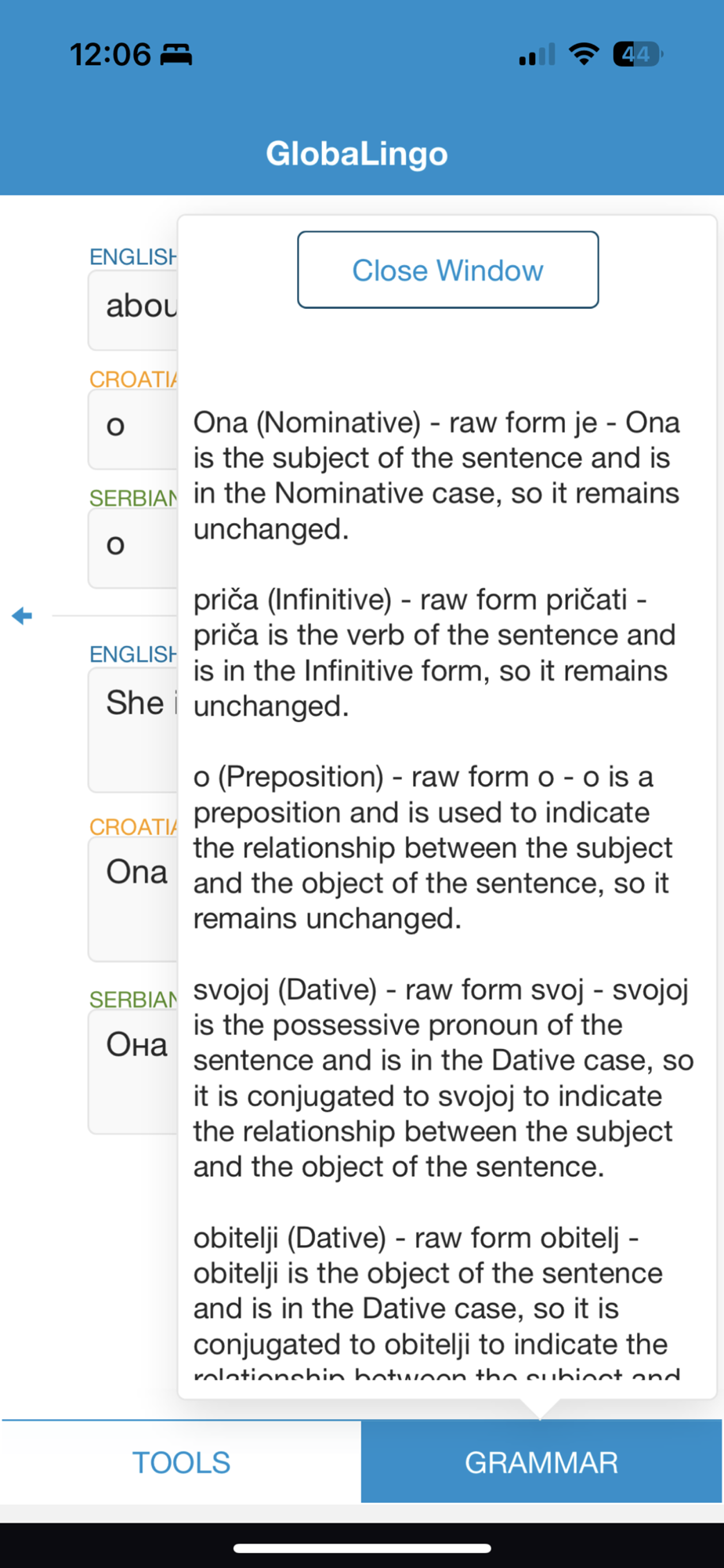 The app allows you to categorize words, allowing you to easily review groups of words that need more frequent practice. The app also includes detailed conjugation explanations for verbs, making it easier to understand and use them in context. The phrases were generated with the intent to allow you to see how various words conjugate in relation to others. The explanations help provide detailed reasoning for the rules applied.