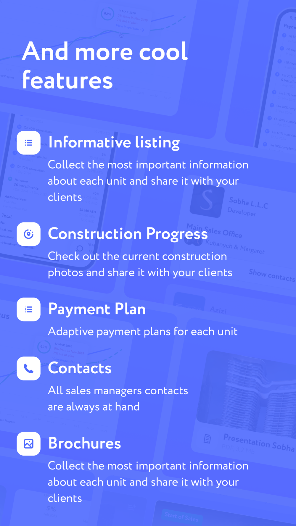 • Information on off-plan units from trusted developers - our app provides real estate agents with access to information on new projects and apartments from verified developers.