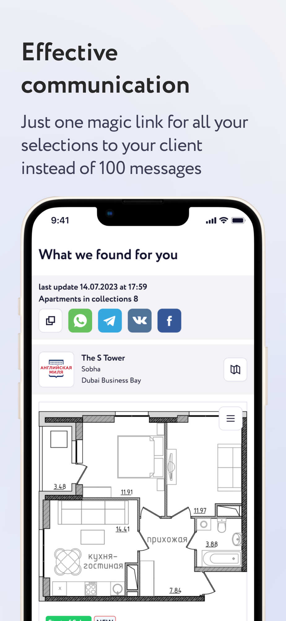 • Tools for communication with clients - we provide tools that help agents connect with their clients, provide them with up-to-date information on apartments and projects, and respond to their questions and requests.